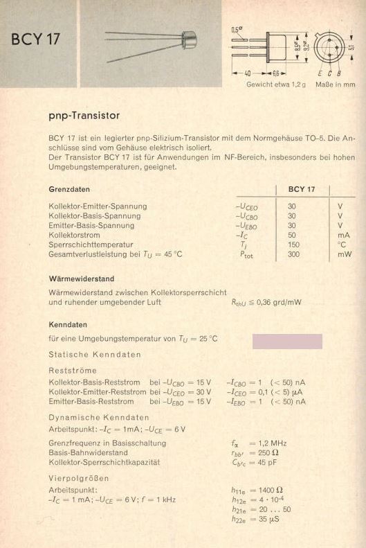Verkaufe BCY17 PNP Transistoren (technische Daten siehe "Datenblatt"). Transistoren sind "new old stock", waren also noch nie verbaut. 11 Stück vorhanden, Preis pro Stück 10€ inkl. Versand.