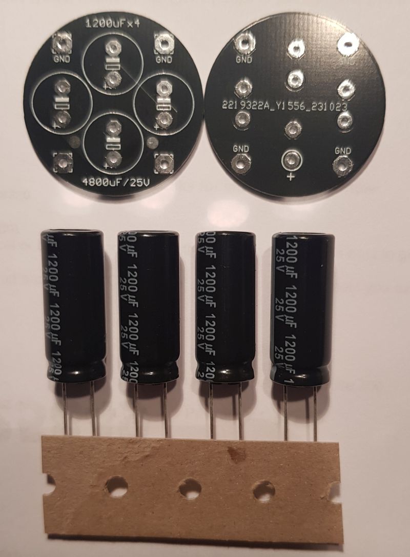 Wer öfters mal ältere Messgeräte von HP oder Tektronix repariert oder überholt findet sehr oft ELKOs von Sprague vor die richtig platt sind. Es sind fast immer solche mit 4000µF/15V im Netzteil der Versorgung der TTL-Schaltungen. Diese haben 5 Pins, 4 x - und 1 x + wobei die - Pins auch Bestandteil vom Layout sind und das Gehäuse als Brücke verwendet wird. Als Ersatz habe ich 4 Reparatursets übrig die diesen Elko perfekt nachbilden. Eine zweiseitige Platine mit 30 mm Durchmesser und 4 passende hochwertige Panasonic Elkos 1200µF/25V (EEUFR1E122LB). Das Gebilde ergibt eine solide Konstruktion für die Reparatur die man mit Einzelelko und Drahtbrücken nur umständlich erreicht und ist mechan. stabil. Ein Set soll 8€ kosten, Versand im Polsterbrief ist da schon dabei. Interessenten schreiben eine Mail an: mail-an-tillk bei web.de