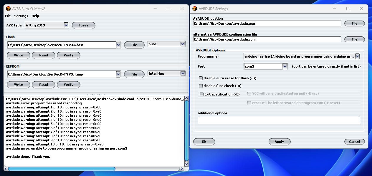 > Flip Davon hatte ich noch nicht gelesen, danke für den Hinweis: https://www.microchip.com/en-us/development-tool/flip https://docs.arduino.cc/hacking/software/DFUProgramming8U2 Damit kann man den ATmega16U2 für andere Zwecke umfunktionieren. Das gilt aber nur für exotischere AVR, nicht die älteren wie 2313 oder 328. > ein UNO, original mit Bootloader, und aufgespielten Arduino as ISP Sketch so hatte ich das verstanden. Geht es auch anders? Klar, einen ISP-Programmer anschließen geht immer. Aber nochmal für Nico: das Feld "additional options" im Burnomat ist unverzichtbar für die Einstellung der Baudrate.