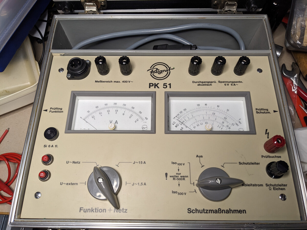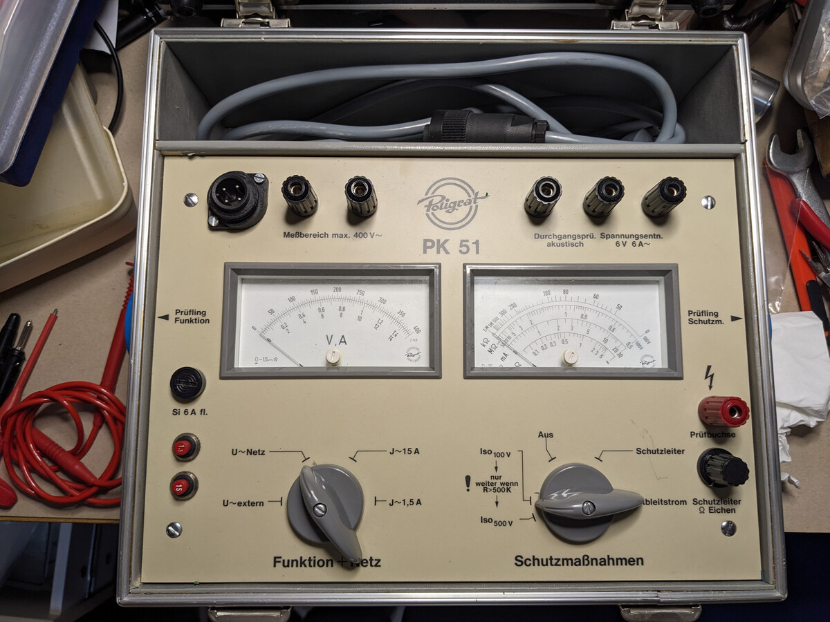 Sicherheitstester Poligrat PK51. Der Tester ist Baujahr 1978 und nicht geprüft. Das spezielle Netzkabel liegt bei. Und es gibt dazu eine Menge Laborkabel + Klemmen. Leider waren manche mit Gummiringen zusammengehalten, die klebrig wurden. Lassen sich aber reinigen. Sorry für die miesen Bilder, dank LED-Funzeln gehen Abends keine besseren mehr. 35€ zzgl. Versand Das Ding ist schwer, ich hab's noch nicht gewogen. Aber man wird sich schon einig.