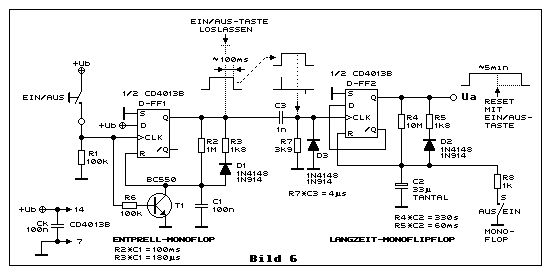 Guten Morgen! ich habe folgende Schaltung aufgebaut, die auch wie beschrieben funktioniert. https://www.elektronik-kompendium.de/public/schaerer/monoff.htm Leider ist der Ausgang Q von D-FF2 nach den Einschalten der Versorgungsspannung (5V aus LM7805, +100n an VCC am IC) immer "High". Nach einmaligen Hin und Herschalten funkioniert das ganze dann wie es soll. D-FF2 ist als reines Toggle-Flip-Flop mit Pin 4 auf GND beschaltet. (also ohne R4,R5,R8,D2,C2 und dem Schalter) Was kann ich tun um zu erreichen, dass der Ausgang Q in eingeschalteten Ausgangszustand sicher "LOW" ist? Ich habe das ganze oszilloskopiert und denke, das kein Schaltungsfehler vorliegt. VG Mike