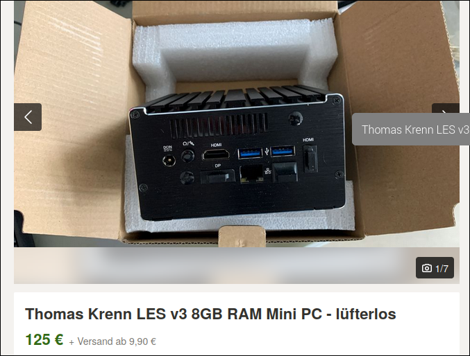Verkaufe 6 Stück Thomas Krenn LES v3. Wurden nur einmal installiert (Ubuntu 22.04 LTS), aber dann nie benutzt, da aus dem Projekt doch nichts wurde! Alles original Zubehör ist mit dabei. Details: - Industrielles Design, absolut geräuschlos durch passive Kühlung - Qualitativ hochwertige Industriekomponenten - Für den 24/7 Dauerbetrieb und mobilen Einsatz geeignet - Intel Celeron N3160 (4 Cores, 1.6GHz) - 2x 1 Gbit/s LAN (RJ-45) - 8 GB RAM - 64 GB mSATA - 2 x HDMI - 1 x Displayport - COM Port - Audio Port - Hardwaregestützte Verschlüsselung via Intel AES-NI - bietet Platz für 1x mSATA und 1 x 2,5" Datenträger - USB-Ports: 2x (USB 3.0) (Front), 2x (USB 3.0) (Rückseite) - Größe: 65 mm (H), 116 mm (B), 110 mm (T) - Umgebungstemperatur von 0 - 40 °C - Mini SIM-Karten Halter - inkl. Vesa Halterung 100x100, Hutschienenmontage möglich PREIS: € 129,- (zzgl. €9,90 Versand)