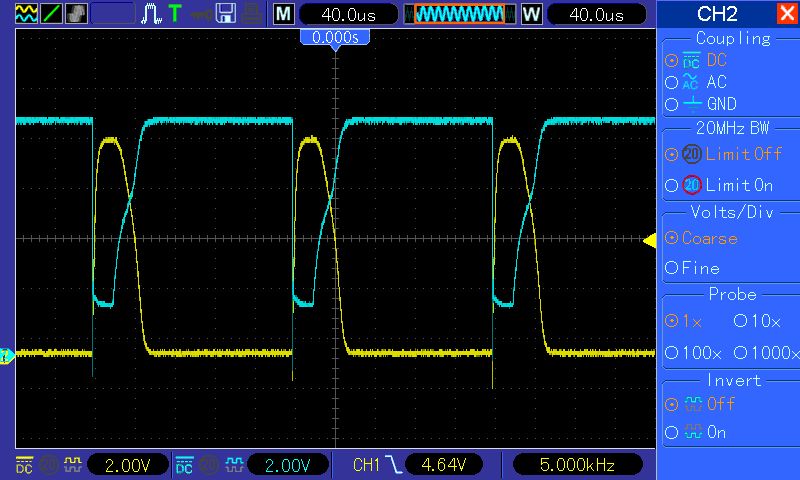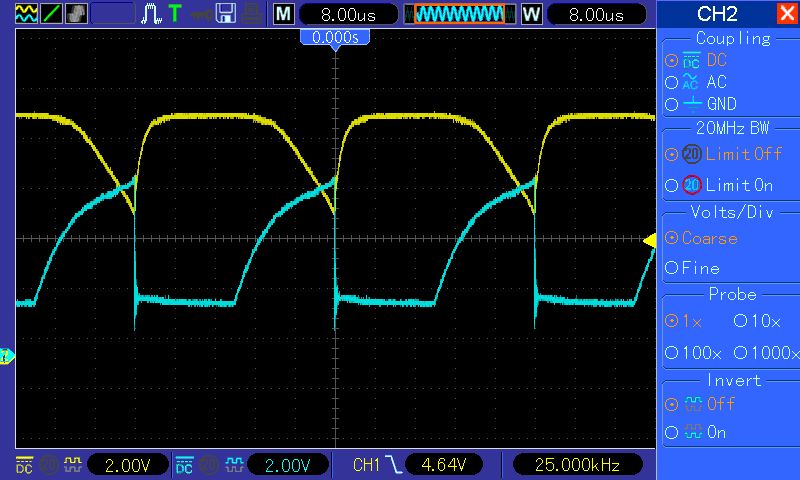 Mein angegebenes Beispiel mit dem IRF4905 funktioniert so nicht bei 25kHz - ein kurzer Test mit einem BS170 zur Ansteuerung zeigt, dass das Umladen der Gate-Kapazität nur per Widerstand zu lange dauert. Erst ab Frequenzen unterhalb von 5 kHz oder einem deutlich verringerten Widerstand (oder natürlich einem spezialisierten Treiber) schaltet der Hexfet halbwegs sauber durch. Die gelbe Linie ist die Ausgangsspannung (Last), die blaue die Gate-spannung am Hexfet. Unter Last brach die Spannung wegen zu dünner Anschlussleitungen auf 9 V zusammen, daher stimmen die Amplituden in den Screenshots nicht so ganz. War ja auch nur als Anregung gedacht ...
