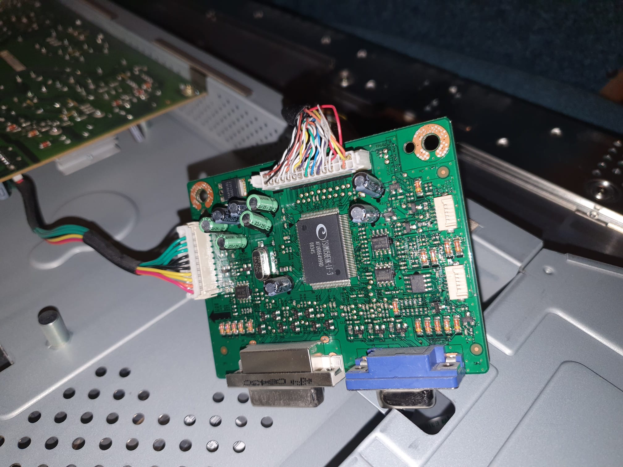 Mein Zugang ist hier als neuer Nutzer leider auf einen Beitrag pro halbe Stunde begrenzt... @H. H. : Meinst Du, schauen ob nur die Beleuchtung ausgeht, aber die Pixel geschaltet werden? Ich glaube, die Rückseite vom Display lässt sich nicht so lösen, dass ich sie wieder dran kriege. Müsste ich schauen Angenommen das wäre der Fall. Ließe sich das Problem überhaupt mit relativ einfachen Mitteln beheben? Und ist das die wahrscheinlichste Ursache? Ein Problem mit der Synchronisation kommt eher nicht in Frage? @ David B.: Das Modell ist S2309Wb . Da ich mich vor einiger Zeit damit beschäftigt hatte und den wieder zusammengebaut habe, habe ich nur einige Bilder der Platine mit der "Controller"-Einheit. Ich ging davon aus, an der Stromversorgung etc würde es nicht liegen, was auf der anderen Platine wäre. Derzeit habe ich hier nur Lötkolben und Zubehör, Multimeter und kleines Testgerät für Transistoren, Dioden usw ABER wenn es eher danach aussieht, dass sich der Aufwand auch angesichts der Möglichkeiten bei mir nicht lohnt, dann würde ich es lassen.