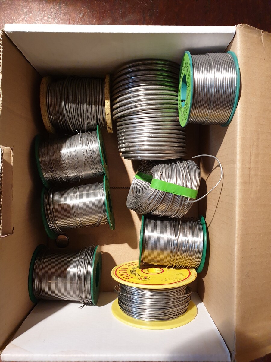 Hallo Zusammen, zu haben sind hier verschiedene Rollen Lötzinn, alles Sn60Pb40 - 3x 1mm knapp jeweils unter 1 Kg je 40 Euro - 1x 0,5mm 950 Gr 40 Euro - 1x 1,5mm 500 Gr 20 Euro - 2x 1,5mm 1 Kg 40 Euro - 1x 1,5mm 600 Gr 15 Euro - 1x 4mm 2 Kg 80 Euro Zusätzlich Versand.