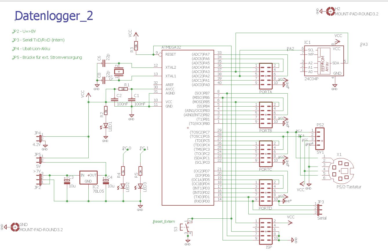 Platinenüberschuss: universelle Atmega 40PDIP abzugeben Kleine Platine ohne SMD-Bauteile für alle Atmega mit PDIP-40 Sockel. Atmega16/32/64/644/164A/324A/1284 u.s.w. Abmessung 50mm x 80mm Ausstattung siehe Schaltplan: Alle Ports sind einzeln mit PINheads verfügbar. Jeder 10-polige Steckanschluss verfügt zusätzlich über einen GND- und VCC-PIN. Steckanschluss für ISP, RX/TX/GND und 4 PINs für PS2-Tastatur vorhanden. 2LEDs für Signale, Fassung für EERAM 24C512/1024 oder ähnliche. 5V Spannungsregler, PINs für LIion Direktversorgung, 7805-Regler. Meine Anwendung (s. Bilder) ist z.Z. ein Datenlogger mit I2C-LCD, EERAM, DS18B20 Temp-Sensor und DCF77-Empfänger. Über die angeschlossene PS2-Tastatur wird u.a. Start, Stop und die serielle Ausgabe gesteuert. Einige Platinen möchte ich zum Preis von je 1.-€ abgeben. VK: 1.--€ bei einer Platine 1.20€ bei zwei Platinen Die .brd-Datei verschicke ich zusätzlich als Bestückungshilfe. Anfragen bitte über PN.