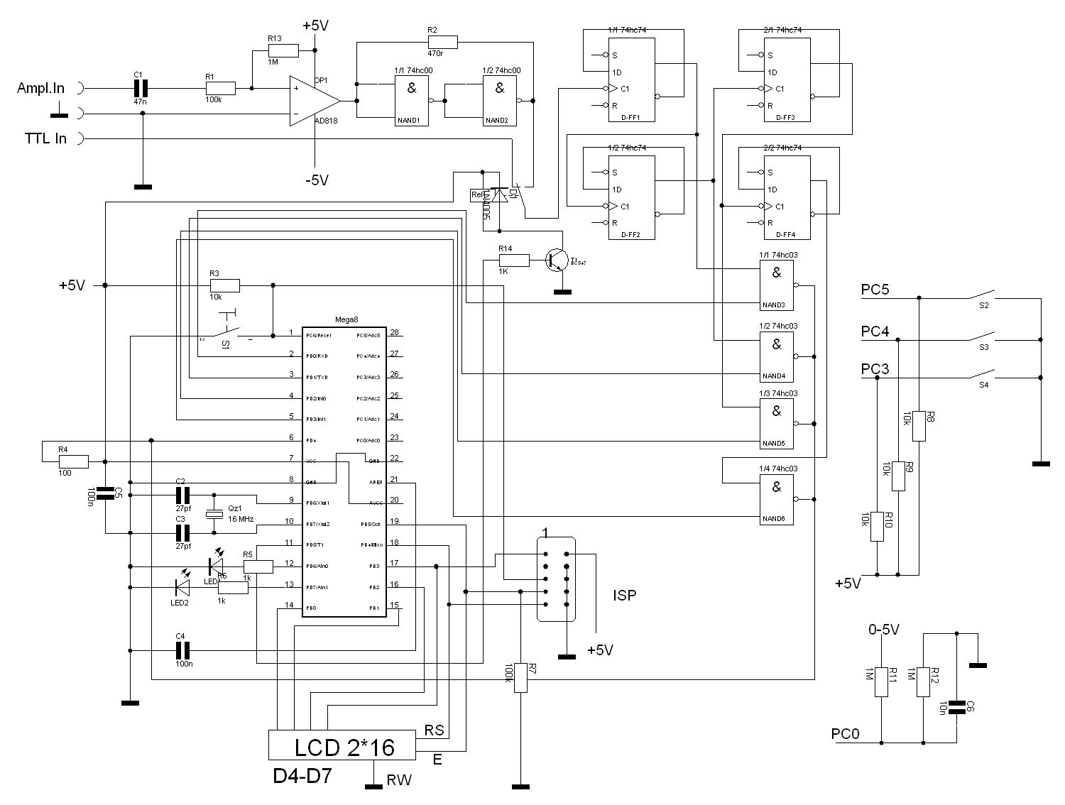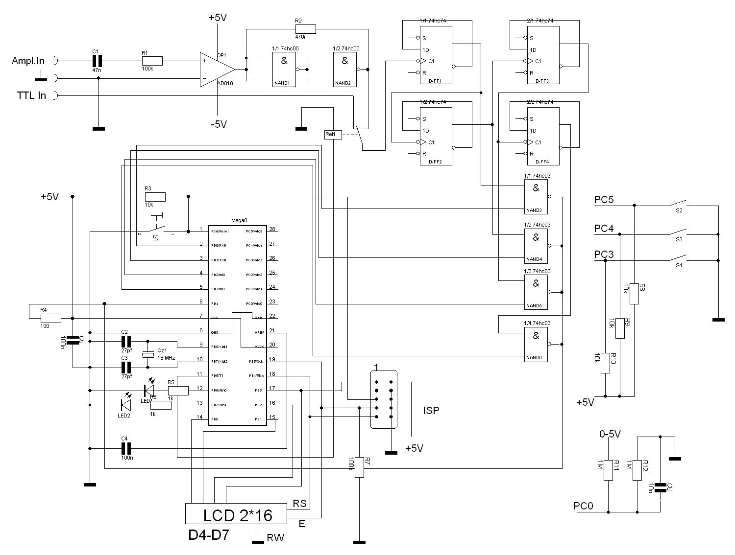 So, ich habe das Programm um folgende dinge erweitert. Eine TTL-Anzeige High/neutral/Low Teiler wird automatisch gewählt 2/4/8/16 Spannungsanzeige bis 5V (max 10V am eingang) Aber das mit der Frequenzanzeige beckomme ich nicht hin. Da würde ich euch nochmal um Hilfe bitten.............. MfG Mr-400-Volt