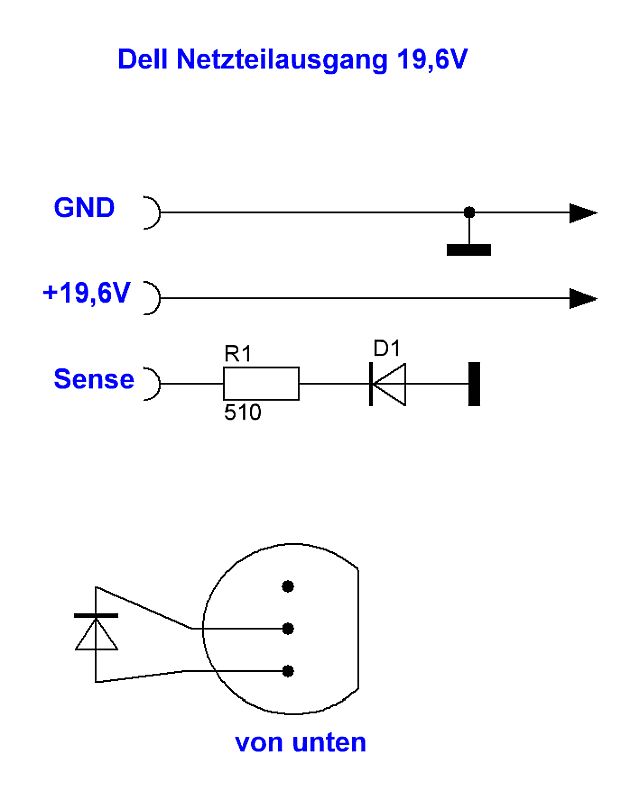 Hallo Leute, erstmal ein erfolgreiches Restjahr noch ;) Für meine ODB2-Versuche im Auto habe ich noch einen älteres DELL-Notebook am Start. Der Akku kommt noch auf etwa eine Stunde, das geht gerade so. Zuhause stöpsel ich ein Netzteil an, doch während der Fahrt wird das wohl schwierig. Also habe ich mir eine passende Boost/Buck Platine beim Amazon beschafft, damit klöppel ich die rund 13,8V vom Bordnetz auf die geforderten 19,6V. Das Teil macht bis zu 15A, reicht also völlig aus (Originalnetzteil hat 19,6V/4,5A) Das Ding hier: https://www.amazon.de/dp/B07SCB1FBQ?psc=1&ref=ppx_yo2ov_dt_b_product_details Allerdings hat das Dell irgendeine "Senseleitung" um nur "Originalnetzteile" zuzulassen. Wenn diese nicht angeschlossen ist, startet das Notebook zwar mit dem Netzteil, aber lädt nicht. Mit einem Multimeter gemessen liegt auf der Senseleitung ca. 3,2V, allerdings am Oszi stark verrauscht. Zunächst hatte ich mit einem Spannungsteiler diese Senseleitung am neuen Netzteil auf etwa 3,2V gelegt, brachte nichts. Dann habe ich kurzerhand das DELL-Netzteil (kein Original) aufgemacht und die Schaltung am Sense verhirnt. Naja, soviel Hirn braucht es nicht, es sind nur zwei Bauteile. In Reihe liegt ein 510 Ohm und danach ein "C4381", was immer das sein soll. Laut Goggle wohl ein Transistor, doch es ist nur eine Diodenstrecke wie im Bild gezeigt beschaltet (und im "Transistor" auch offen). Ich kenne es, dass man so auch Z-Dioden mit ca. 6,2V nachgemacht hat, doch eine testweise angestöpselte ZD brachte keinen Erfolg (von 2,7-11V alles versucht) Löte ich aber diesen C4381 an diese Stelle im neuen Netzteil, funktioniert auch das Laden. Bin etwas ratlos, ..... Old-Papa