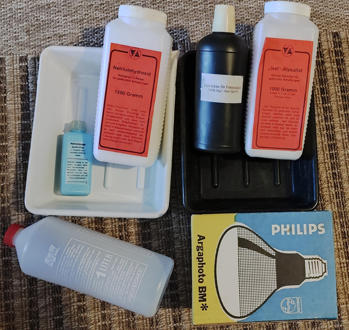 Ich möchte diverses Ätzzubehör abgeben. 2 Schalen Ätzmittel, Entwickler (die Flaschen sind ca. 3/4 voll) 1 braune und 1 helle leere Flasche 1 Belichtungslampe (UV, 500Watt) Zusammen für 10.-€ + 6.90€ VK Anfrage bitte als PN