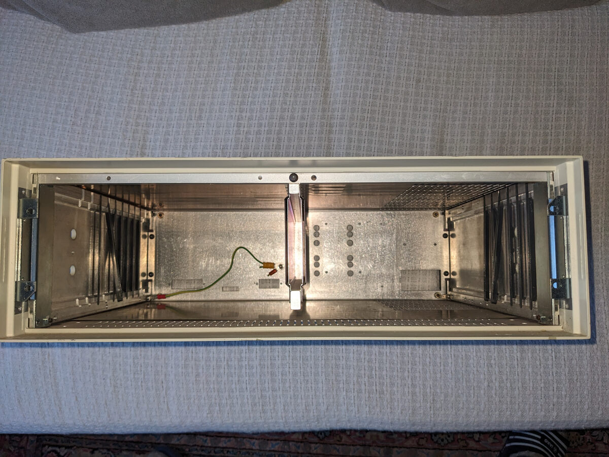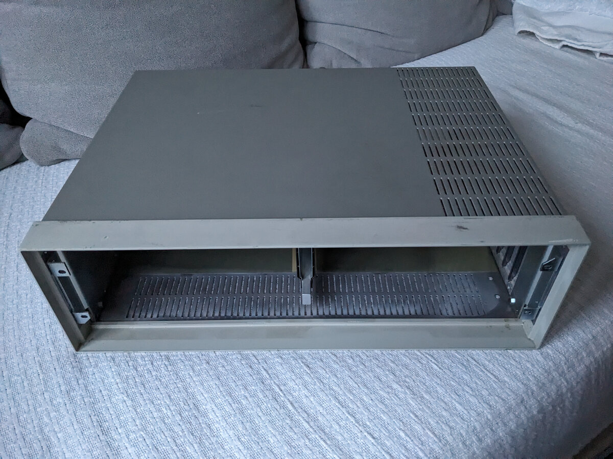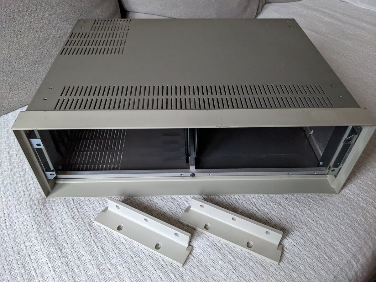 19-Zoll-Gehäuse, zum Einbau oder als Tischgehäuse. Es sind 2 Einbauwinkel dabei. Der Platinenhalter in der Mitte lässt sich herausnehmen. Maße (ungefähr): Höhe: Frontrahmen 13,5cm, Gehäuse 13cm Breite: 42,5cm Tiefe: 32,5cm, mit Abstandshalter an der Rückseite 34cm 10€ zzgl. Versand - RESERVIERT -