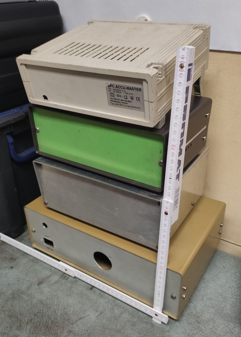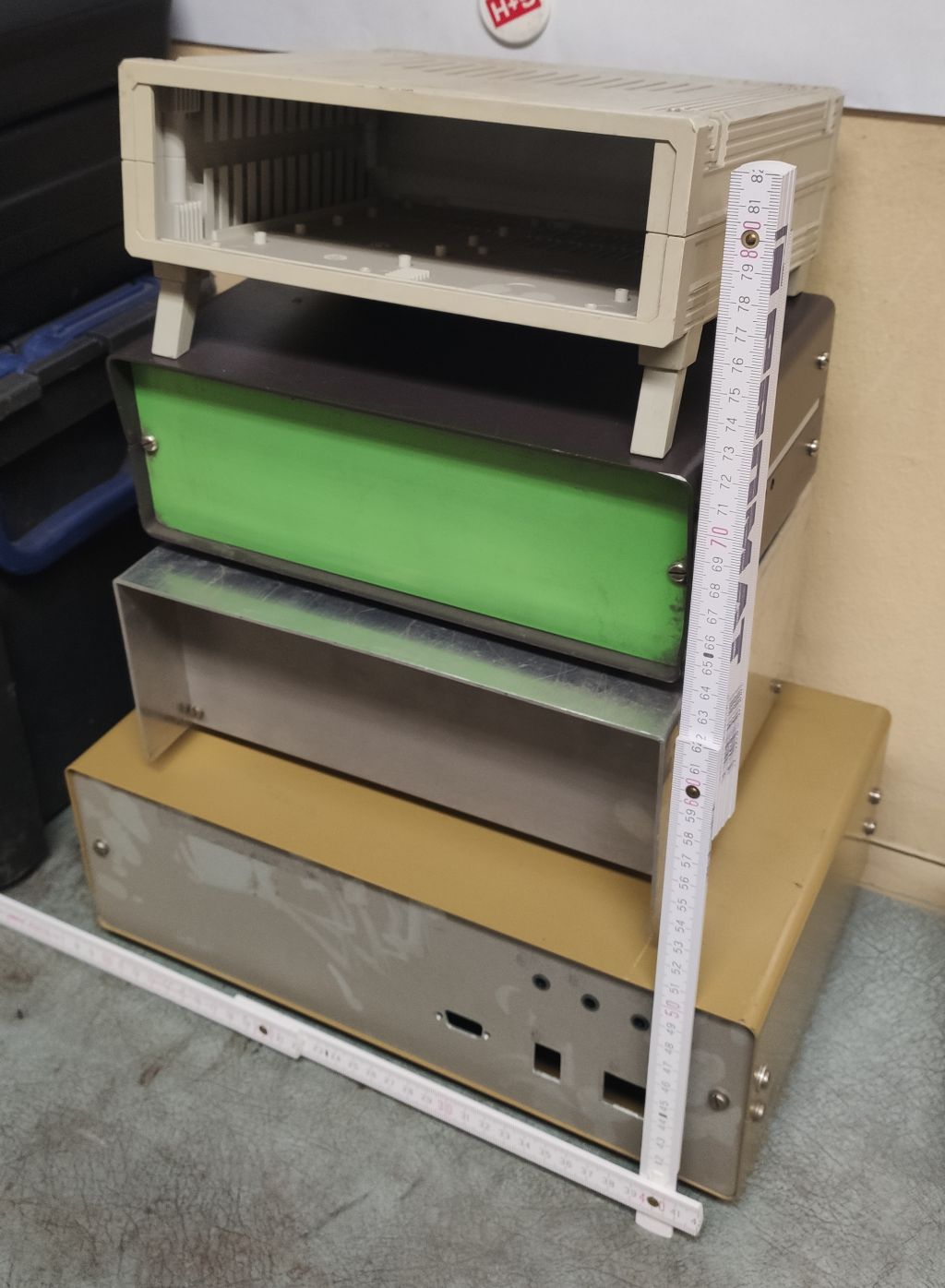 Verschenke 4 alte Gehäuse gegen Versandkostenerstattung. Ist ein Kunststoffgehäuse, zwei Stahlblech und ein Alu-Gehäuse. Maße sind aus dem Meterstab rechts ersichtlich. Bei Interesse einfac email. Joachim