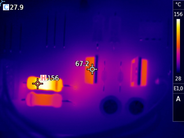 PS: Habe die Regler gefunden: T7812CT 7912CT Also 12 Volt und nicht wie in der Schaltung 15V. Die Dinger werden so heiß, dass man sie nicht anfassen kann. Kein Kühlkörper dran und auch noch direkt neben der 230 V Leitung für die Röhre. Aber der Rippel der Regel scheint ok. Unter 3 mV. Zudem sind dort noch zwei Widerstände R21 und R20. R21, oder obere wird über 150 Grad heiß, der untere um die 60 Grad °C. Beide haben ca 170 Ohm. (Siehe Infrarotbild) Bei R21 fallen 15 Volt ab, bei R20 9 Volt. Meint ihr das ist normal die hohe Temperatur und die "Schieflast"