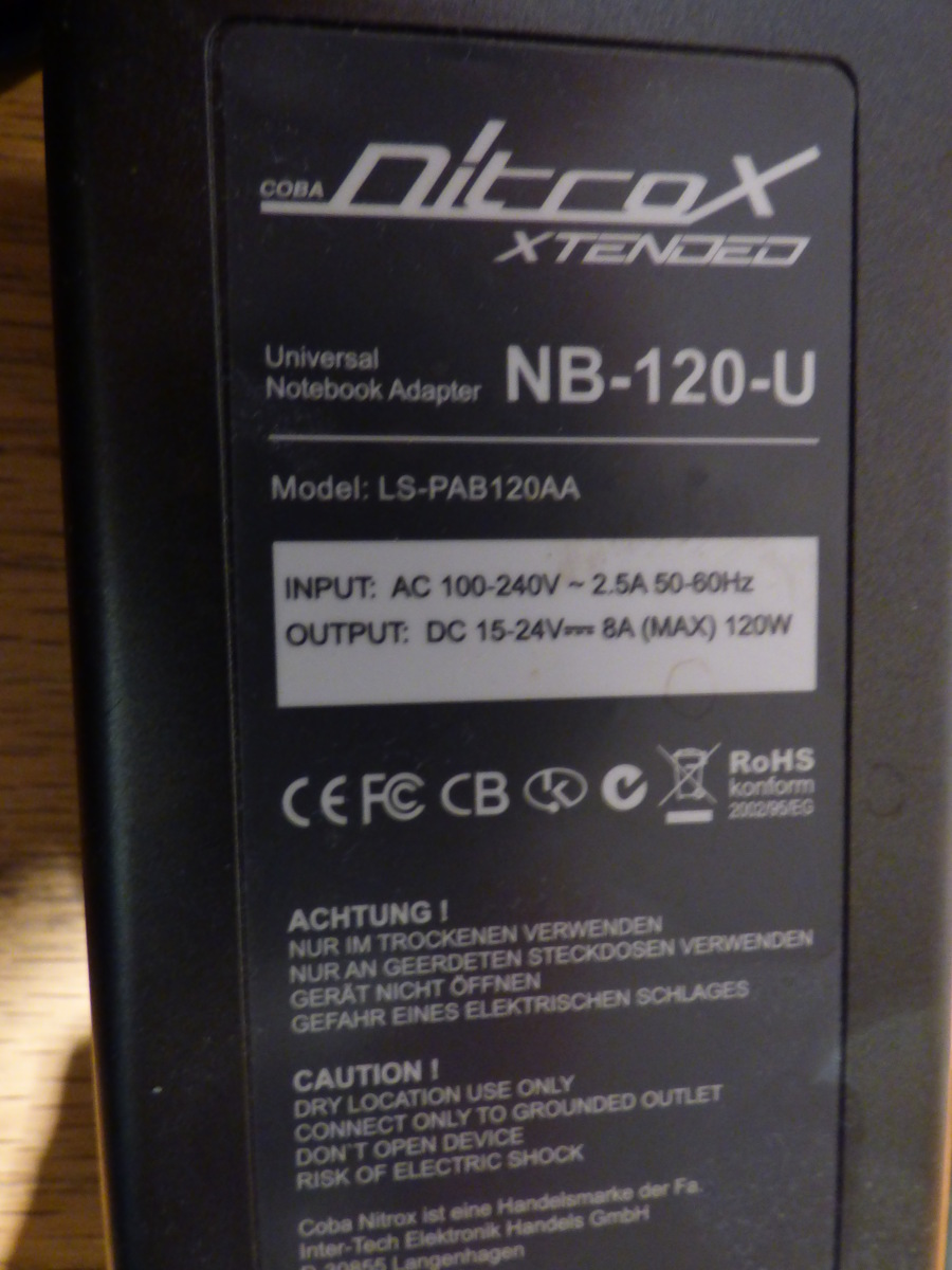 Biete hier ein Universal Notebook/Laptop Netzteil der Marke Coba Nitrox XTended an. Adapter: NB - 120 - U Model: LS - PAB120AA Input: AC 100 - 240V, 2,5 A, 50-60 Hz Output DC 15-24 V, 8A (Max), 120W Weitere Details: https://cms2.inter-tech.de/index.php?option=com_content&view=article&id=216%3Acoba-nitrox-xtended-nb-120u&catid=111%3Anotebook-netzteil-archiv&Itemid=247&lang=de Barzahlung bei Abholung, Überweisung per PayPal bei Versand. Bitte um Verständnis, dass bei Versand die Versandgebühren hinzukommen. Da dies ein Privatverkauf ist, erfolgt der Verkauf unter Ausschluss jeglicher Gewährleistung, daher sind Garantie, Gewährleistung und Rückgaberecht ausgeschlossen.