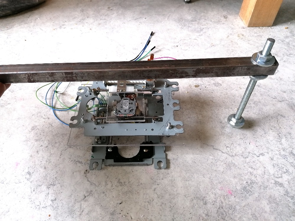 Der xy-Tisch ist soweit fertig. Leider habe ich mir beim Bohren einen DVD-Schlitten ruiniert. Den musste ich danach kleben und hoffe, dass er jetzt noch hält. Für die Halterung des Cantilevers verwende ich einen Viereckstahl und eine M8 Gewindestange. Dann kann ich die Höhe des Cantilevers auch schön einstellen... Jetzt warte ich eigentlich nur noch auf den TSL1401 Liniensensor aus China. Bis dieser ankommt, wird es aber noch dauern. Inzwischen werde ich den mechanischen Aufbau komplettieren.