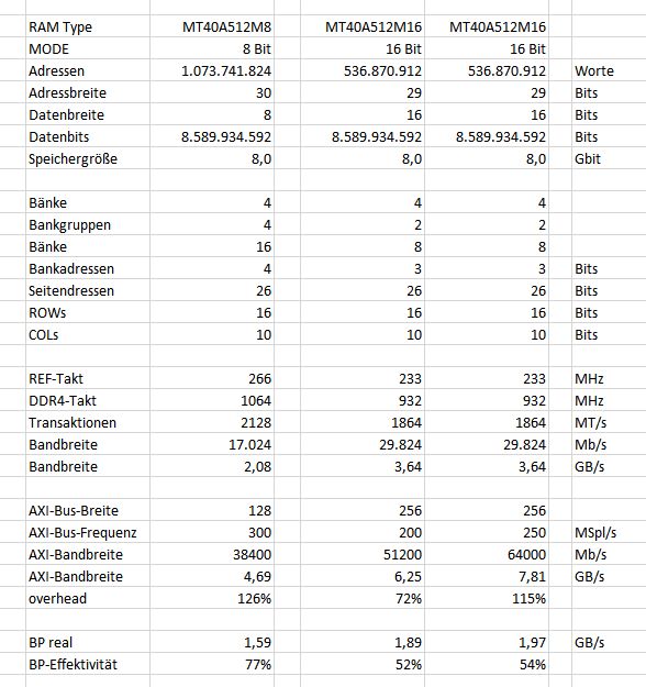 Wir benutzen einen FPGA mit DDR4-Interface und Automotive DRAM. Haben von 8B auf 16B umgestellt, um mehr Bandbreite zu bekommen. Wegen Busverdrahtung und anderer Gründe läuft das Interface zum RAM nicht mehr auf der vorherigen Bandbreite, was aber vom RAM her nichts ausmachen sollte. Wie in der Tabelle belegt, sollten es bis zu 3,6GB/s statt 2,1 sein. Angeschlossen ist ein AXI4MM auf jetzt 200MHz wegen Kompatibiltität zum Controller, statt vorher 300MHz. Die Bandbreite vom AXI-Bus hat damit 1,7x mehr, als nötig. Sollte also reichen für 2/3 Transaktionsdichte, bei maximaler RAM-Bandbreite. Jetzt ist die tatsächlich gemessene Bandbreite aber gerade knapp 1,9 von 3,6 möglichen. Zuvor waren es 1,6 von 2,1. Obwohl der RAM-Baustein also mehr Daten anliefern können müsste, ist die Steigerung gering. Zuvor waren es 77% (von 90% möglichen wegen Refreshs ein guter Wert) und jetzt sind es nur noch 52%. Warum ist das so? Ist der AXI die Bremse im System?