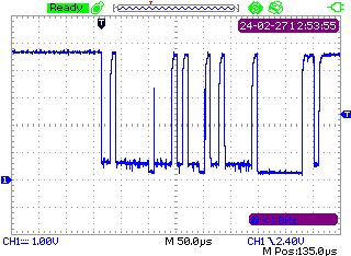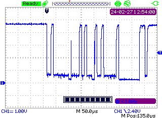 Ich habe da ein Problem mit I2C via Optokoppler(OK). Konkret möchte ich über OK mit einem MCP23017 quatschen. Dem MCP "Daten" schicken funktioniert auch, was nicht klappt ist der Weg vom MCP zum Mikrocontroller. Ohne die OK funktioniert alles wie erwartet. Wenn ich die Signale (vgl. Screenshots) richtig interpretieren dann bekomme ich das NACK nicht zurück. Ich weiß nur nicht warum? Die Schaltung basiert auf die AN4 von Vishay (Optical Isolator for I2C Bus System), statt der dort beschriebenen VOH-Optokoppler verwende ich lediglich die Optokoppler HCPL-2611. Ganz offensichtlich geht lediglich der SDA-Pfad vom MCP zum Mikrocontroller nicht aber ich steig noch nicht dahinter warum. Kann jemand vielleicht erkennen wo der Hase im Pfeffer begraben ist? I2C_Optokoppler.png ist der Schaltplan wie die Schaltung auf dem Steckbrett aufgebaut ist. OKs, Widerstände, Kapazitäten und Dioden dimensioniert wie im Schaltplan angegeben. Die Oszilogramme zeigen jeweils SDA, gemessen am MCP. Es wurde hier stets das Register 0x14 gesetzt bzw. gelesen, zuvor wurde Register 0x00 auf 254 gesetzt: Setzen_uC.BMP zeigt das Oszilogram beim Setzen wenn der MCP direkt am Mikrocontroller hängt Lesen_uC.BMP zeigt das Oszilogram beim Lesen wenn der MCP direkt am Mikrocontroller hängt. (Ich bekomme auch den Erwartungswert!) Setzen_OK.BMP zeigt das Oszilogram beim Setzen wenn der MCP am Optokoppler hängt Lesen_OK.BMP zeigt das Oszilogram beim Lesen wenn der MCP am Optokoppler hängt, ich bekomme einen I2C-Fehler, und zwar dass kein NACK kam (was man auch im Oszilogram sieht, das NACK fehlt). Wie gesagt, das Setzen funktioniert. Ich kann, wie hier im Beispiel angegeben, gezielt GPA0 wie gewünscht auf High oder Low setzen. Mir fehlt aber das Lesen des MCPs da ich später nicht nur den MCP setzen will sondern auch Portpins auf ihren Zustand auslesen möchte.