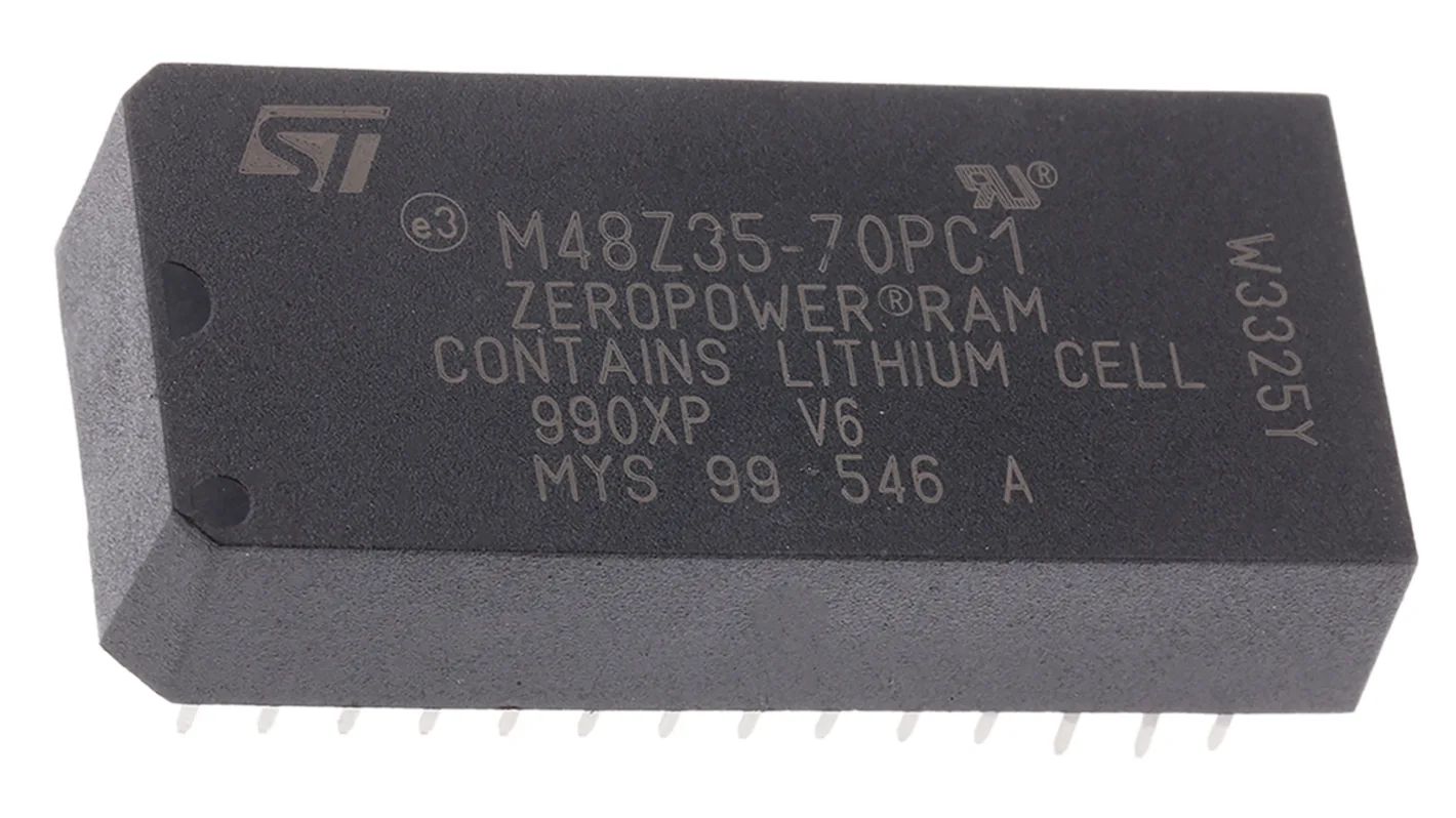 > Batterie auf der Geräteplatine eingelötet Das beantwortet indirekt meine Frage, es ist also kein NVRAM, sondern das ältere Handbuch trifft zu, mit einer externen "Li-Batterie", vielleicht eingelötet aber frei zugänglich. > Dallas-RAMs https://de.wikipedia.org/wiki/Dallas-Chip Hier verlinkt eine Anleitung mit Fotos des geöffneten ICs: http://web.archive.org/web/20160927074523/http://reocities.com:80/SiliconValley/peaks/8491/rtc_de.html Ebenfalls verlinkt: http://www.mcamafia.de/mcapage0/dsrework.htm auch hier ein Foto "After the dust cleared". Epoxid-Staub soll ungesund sein, aber ich habe es bisher überlebt. Im oben gezeigten NVRAM 48Z35 von ST ist die "Batterie" fest im IC eingegossen. Das kann man auch nur noch (wie ich es selbst getan habe) auffräsen und mit etwas Glück die Anschlüsse mit einer externen "Batterie" verbinden. Im neueren Schaltplan ist ein 48Z02 gezeichnet, das dürfte ein kleineres NVRAM derselben Art sein. https://www.st.com/resource/en/datasheet/m48z12.pdf ST hatte zwei Markennamen CAPHAT™ M48Z02 (1999-2020) und TIMEKEEPER® M48T02 (2000-2011) https://www.st.com/en/clocks-and-timers/rtc-parallel-interface-timekeepers.html da ist die Batterie trennbar, Videoausgabe und Dynamisches RAM kann ich auch nicht finden, das muss Thomas geträumt haben.