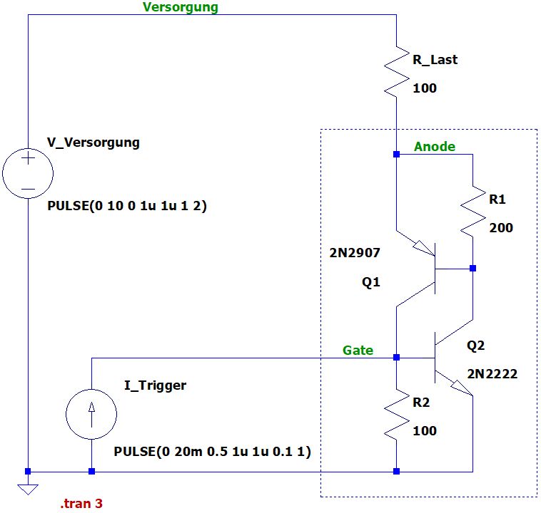 Logisch sperrt der gleich wieder, du nimmst ihm ja den Haltestrom weg. Mach mal eine Diode zwischen die Zündspannungsquelle und den "Thyristor". Und häng die Last zwischen "Anode" und Versorgung. Und dann noch einen Widerstand zur Einstellung des Zündstroms. Und nimm vor allem realere Transistoren!