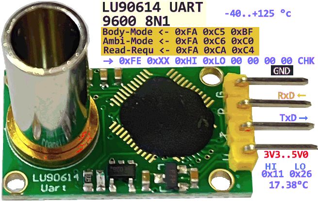 Hallo! Hat Jemand schon den LU90614 zum Laufen gebracht? Der MLX90614 läuft bei mir mit I2C angesteuert sehr schön. Der LU90614 wird anscheinend per UART angesteuert? Datenblatt habe ich bisher nicht gefunden.Gruß