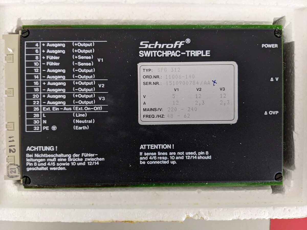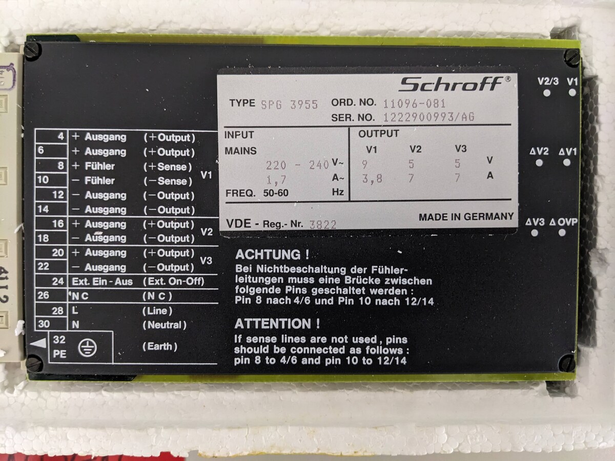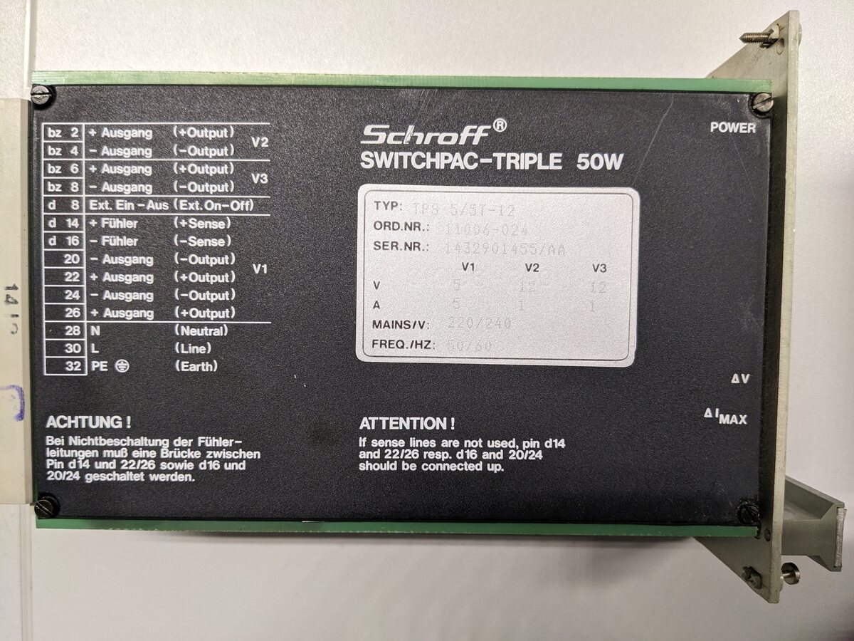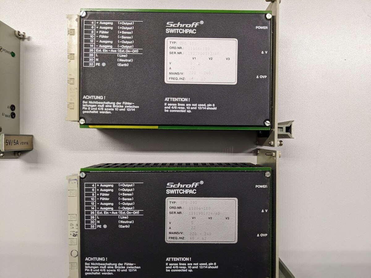 Habe noch ein paar Schroff Netzteile für 19" Rackeinbau beim Aufräumen gefunden, vielleicht hat jemand Interesse: 2 Stück SPG 105, 5V 22A 1 Stück SPG 312, 5V 12 A, 2 x 12V 2,3A 1 Stück TPS 5/5T-12, 5V 5A, 2 x 12V 1A 1 Stück SPG 3955, 9V 3,8A, 2 x 5V 7A Ich würde mal nen Zehner pro Netzteil ansetzen, falls jemand Verwendung für alle hat kann man am Preis ja noch was machen. Abholung im Raum Ostalbkreis / Rems-Murr, Versand ist möglich nach Absprache.