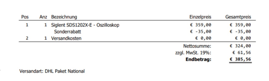 Dieter D. schrieb: > Benjamin S. schrieb: >> 5,50 (incl. Versichertem >> versand) > > 5,51 Euro. (incl. Versichertem > Versand) 5,59 Euro. (incl. Tastköpfen und Versichertem Versand) Erst die Ware und dann die Moneten. Ist Teilzahlung möglich?