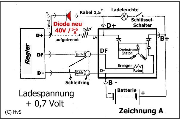 Hallo, die Schaltung des Ladereglers sieht bei meinem Volvo aus wie angehängt. Gehe ich Recht in der Annahme, dass der Anschluss der zur Ladekontrollleuchte und zum Zündschloss führt, auch zur Spannungserkennung verwendet wird? Grund der Frage: Die Lichtmaschine liefert mit Originalregler nur ca. 13,8V Ladespannung, viel zu wenig für neue Ca/Ca-Batterien, dort kann die Spannung kaum hoch genug sein (im Grunde > 14,8V). Das liefert die Lichtmaschine nicht, aber mehr als die 13,8V schon. Ich hatte mal einen Regler mit 14,5V montiert, das hat funktioniert, es wurde aber nur 14,4V erreicht und er ist nach einem Jahr kaputt gegangen. Ich würde nun vor die Lichtmaschine in das Kabel zur Kontrollleuchte eine Diode montieren wollen, so dass dort eine geringere Soannung erkannt wird und der Laderegler weiter auf macht. Hat das schon mal jemand gemacht? Erfahrung? MfG Jens