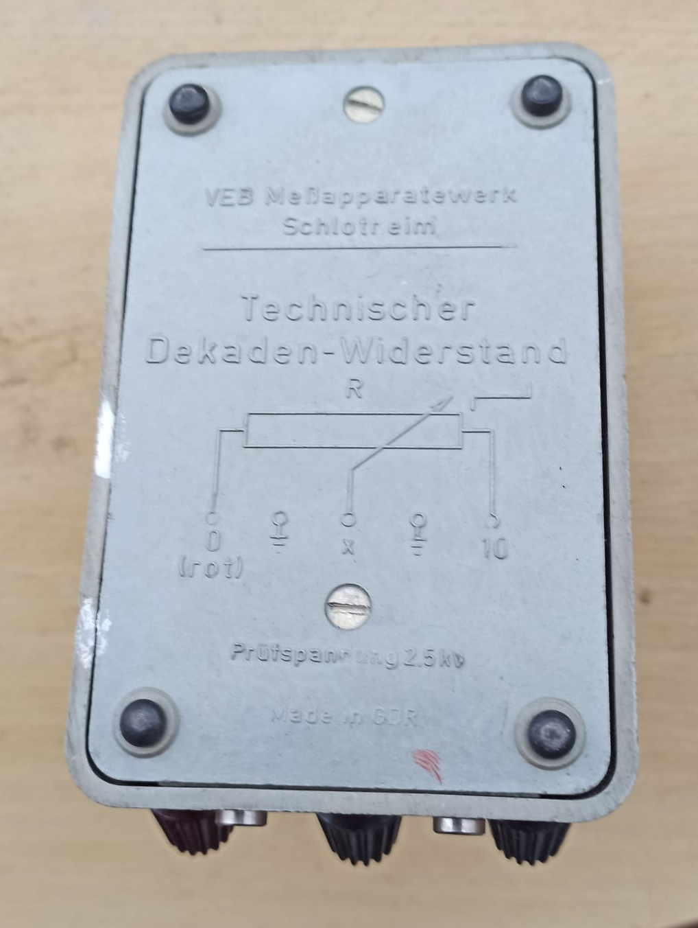 Eine sehr alte DDR Widerstandsdekade, optisch recht gut erhalten. Nur mit einfacher erfolgreicher elektrischen Überprüfung. 13 Euro inklusive Hermes Versand in D Temperatur Bimetall Einsteller. 1,5 Euro Ein mechanisches Zeitrelais mit Endablaufkontakt und Glocke/Klingel Endmeldung. 2 Euro Can Bus Decoder Anfragen und Angebote per PN und MailAdr. Edit:Widerstandsdekade erst mal reserviert. MfG alterknacker