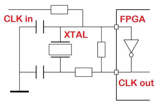 Ich bezweifle ein wenig, ob das klappen kann. Solche Quarze lassen sich nur ziehen, wenn sie ein geringes Q haben. Auch funktioniert das nur bis zu einer gewissen maximalen Frequenz. Der FPGA-Ausgang muss da einiges treiben, um gegen den Quarz anzugehen, d.h. die Widerstände müssen so dimensioniert sein, dass die Verluste des Quarz stabil ausgeglichen werden und andererseits auch so, dass die Schaltung noch beeinflussbar bleibt. Ich habe so etwas schon genutzt, allerdings bei einem 25 MHz-Quarz und der musste nur um 10-15ppm gezogen werden. Der entstehende Jitter wurde dann mit einer internen PLL gefiltert. Es gibt dann trotzdem noch 2 Probleme: 1 ) Einen guten Takt bekommt man im FPGA nur mit einem CCI, d.h. so wie in der Zeichnung einen Inverter draufsetzen und dann als Takt zu benutzen, haut für > 100MHz kaum mehr hin und wenn es funktioniert, hat man eine minderwertige Taktleitung. Besser als PLL intern wird das nicht. Wenn das mit dem FPGA gemacht werden soll, muss der Taktabgriff nochmals extra erfolgen. 2) Es kann Probleme geben, den Takt der von vorn ankommt, überhaupt einzufangen. Man kann da nicht einfach hoffen, dass das funktioniert. Man braucht dann schon eine Schaltung, die den treibenden Ausgang langsam verschiebt, bis er einrastet. Das müsste auch gemessen werden. D.h. man braucht beide Takte, den zu synchronisierenden und den auf den aufsynchronisiert werden soll, beide im FPGA sichtbar.