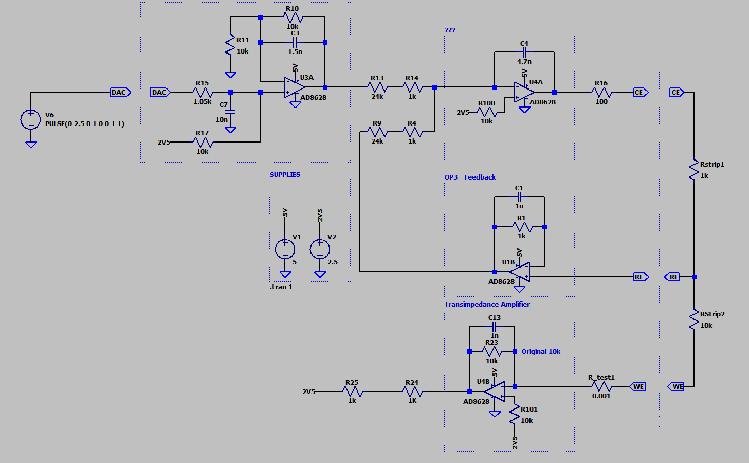 Hallo, erstmal Entschuldigung für das lange Warten. Es wurde ja nach der Anwendung gefragt und ich dachte ich bring ein bisschen Licht ins Dunkel. Es handelt sich um einen Potentiostat (https://de.wikipedia.org/wiki/Potentiostat). Ich habe die Schaltung als LTSpice Schaltplan und Bild hinzugefügt. Ich hoffe das macht sie Sache einfachere und klarer. U3A, U4B und U1B sind mir individuell klar, jedoch wie funktioniert U4A und wie könnte man eine Übertragungsfunktion formulieren, in der Art U4Bout = f(DAC, Rstrip1, Rstrip2). Die Rückkoppelung mit U1B und die nicht ganz klare Funktion von U4A macht mir Kopfschmerzen. Ich frage mich auch ob man mit LTSpice den zeitlichen verlauf des Feedback Loop via U1B sichtbar machen kann? Ich denke das LTSpice 'nur' den Endzustand darstellt oder würde ein starker Tiefpass z.B. nach U1B hier helfen? Und ja, zugegebenermaßen bin ich Anfänger auf diesem Gebiet. Sollte jemand weiterführende Literaturempfehlungen, usw. haben, wäre ich für jeden Hinweis dankbar. MfG