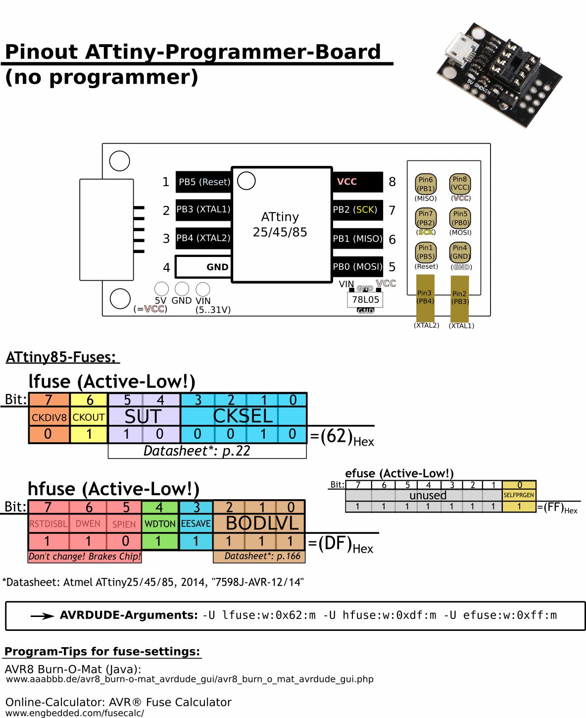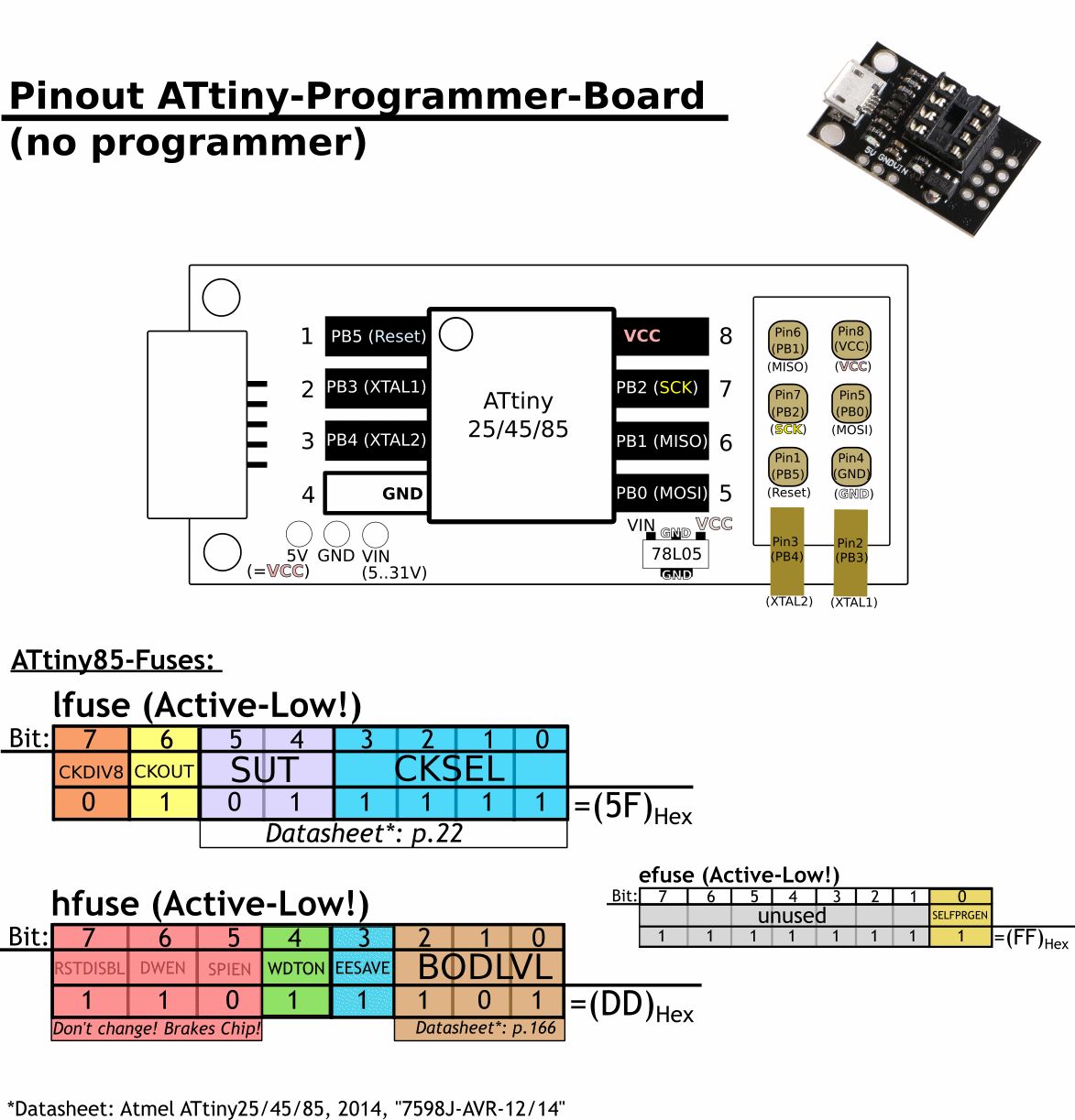 Hallo Forum, es gibt da schon länger diesen ATtiny-"Programmer" in diversen Online-Shops, zu dem es nirgendwo ein Datenblatt gibt. Es handelt sich lediglich um eine Adapterplatine, an die ein Programmer angeschlossen werden muss. Der USB-Anschluss dient optional der Stromversorgung. Alternativ kann auch eine andere Spannungsquelle bis 31V angeschlossen werden. Ein kleiner Spannungsregler regelt dann auf 5V runter. Mit meinem USBasp-Programmer war noch nie eine zusätzliche Spannungsquelle nötig, nichtmal im 3V-Modus. Ich habe alle Pins des "Programmer"-Boards mal durchgetestet und ein Pinout angefertigt. Die Aufschrift auf der Rückseite des Boards ist schlicht falsch. Außerdem habe ich mich beim AtTiny85 mal durch das Thema Fuses gearbeitet und die Bit-Belegung angefügt. Über dieses Forum möchte ich meine Arbeit auch anderen zu Verfügung stellen. Ich hoffe, es wird gebraucht. Das Pinout ist im Anhang. Edit: Die Bitfolge bei den Fuses war für ein Projekt und ist nicht die Standardeinstellung. Daher habe ich sie gelöscht.