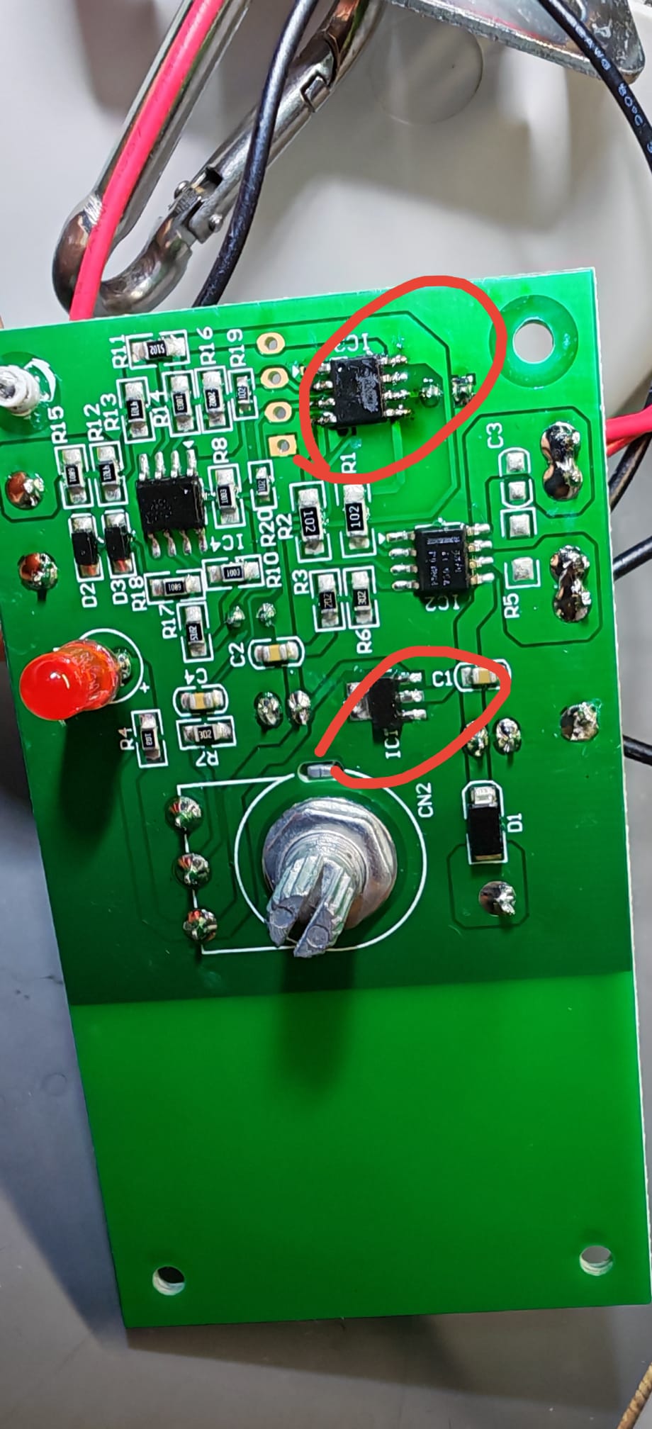 IC2 ist die Motorendstufe, IC1 ist ein Spannungsregler. Es bleibt nur noch ein Verstärker für den Sensormotor, vermutlich IC4 und, wenn die Jungs da einen Controller verbaut haben, wäre das IC3. Also erstmal messen, ob der Spannungsregler noch spielt (Ausgang sollte konstant 5V oder so produzieren). Beschriftungen noch drauf oder sind da alle abgekratzt?
