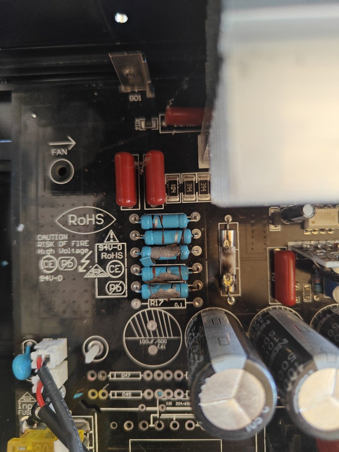 Hallo zusammen, Ich habe hier einen BASBA Wechselrichter 24V 230V 2500W Sinus BaSBa BW-2500-24. Ein Freund hat versehentlich bei einer Schaltung, Netzspannung über eine der Ausgangssteckdosen geleitet. Das Gerät springt an, liefert aber keine Ausgangsspannung mehr. Nachdem ich das Gerät geöffnet habe, habe ich Durchgang an L,N und PE der Ausgangssteckdosen gemessen. Auch die Platinenpunkte für "AC out 1" und "AC out 2" zeigen mir Durchgang an. Außerdem hat es auf der Eingangsseite eine 20A Keramiksicherung und 5 blaue relativ große 0.1 Ohm Shunt Widerstände (vermute ich) direkt daneben geschmort. Auf der Platine steht "R1-R5 0.1", also gehe ich davon aus, dass hier 0.1 Ohm gemeint sind. Messen lassen sich die Widerstände nicht mehr, da sie entweder O.L. oder mehrere Kiloohm anzeigen. (Siehe angehängte Bilder) Ich werde diese Widerstände und die Sicherung tauschen, glaube aber nicht, dass das wirklich das Problem mit dem Ausgang lösen wird. Habt ihr eine Idee, wie ich hier schrittweise vorgehen könnte? Schaltpläne gibt es für die Dinger soweit ich weiß nicht. Ein Oszilloskop wäre für die Fehlersuche vorhanden. Fotos könnte ich gerne bereitstellen. Vielen Dank vorab und beste Grüße