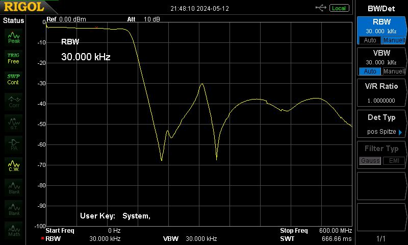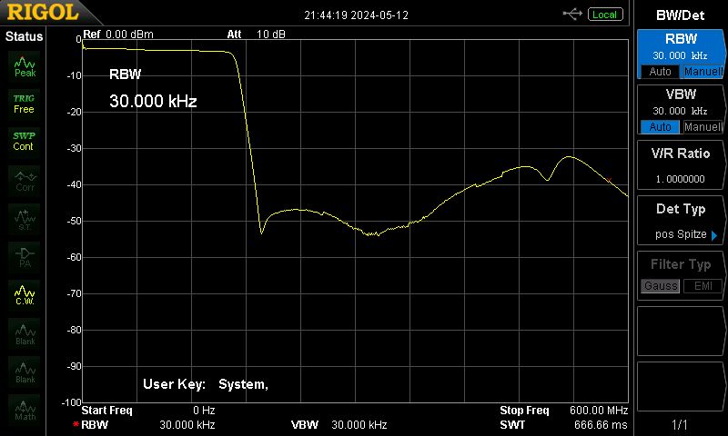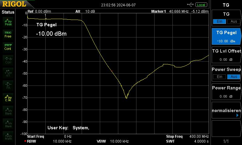Hallo Roland, die Rückseite meiner LP ist vollflächig Kupfer, als Buchse verwende ich die hier: https://www.box73.de/product_info.php?products_id=3493 Die Massebeinchen sind auf der Rückseite verlötet. HF-Tecchnich sollte das in Ordnung sein. Die Resonatorsache habe ich beim Aufbau des Filters ausprobiert. Ich habe nur die C's am ein und am Ausgang bestückt und dann die LP als DUT wie oben eingeschraubt. Da war bis zu -70dB und 1,5GHz nichts zu sehen außer das Rauschen. Deine Sim geht schon in meine Richtung, wahrscheinlich sind die Kapazitäten bei mir noch größer, den die "Nichtmehrdämpfung" setzt ja schon bei 300 MHz ein. Kannst Du mir Deine Sim mal anhängen, damit ich mir das noch mal genau anschauen kann? Vielen Dank für Deine Mühe. Jens