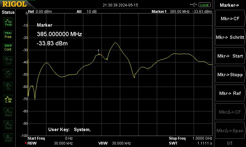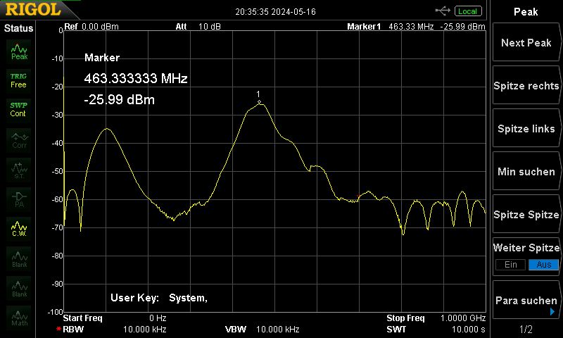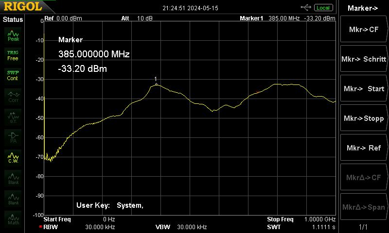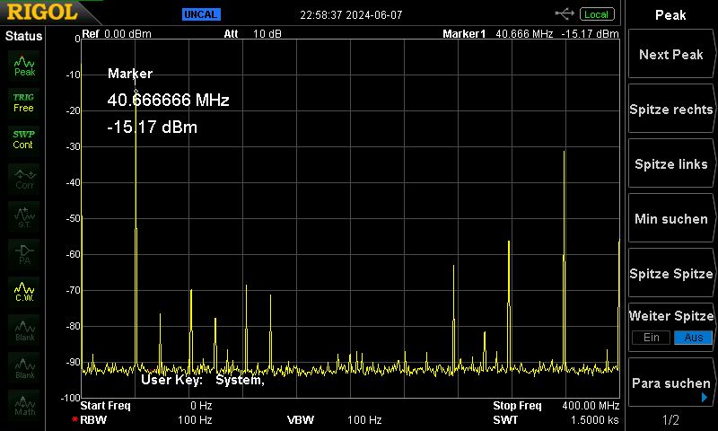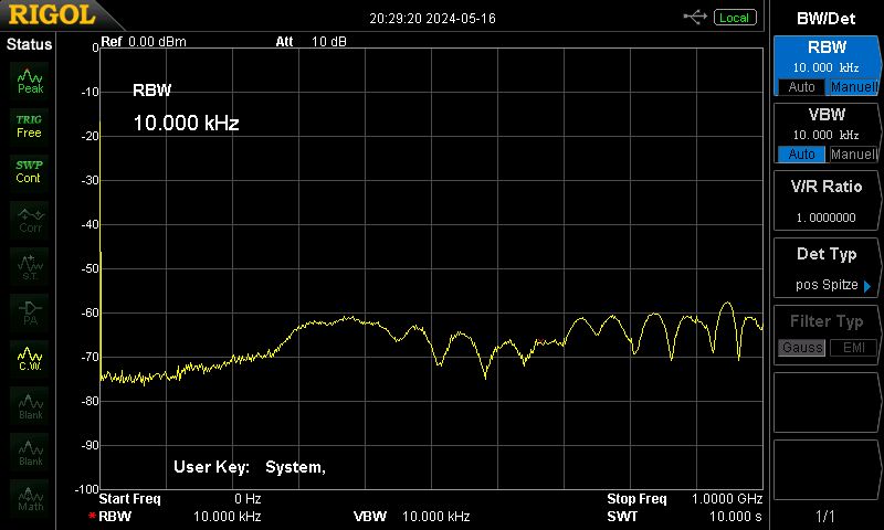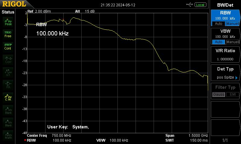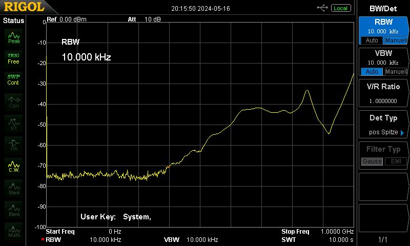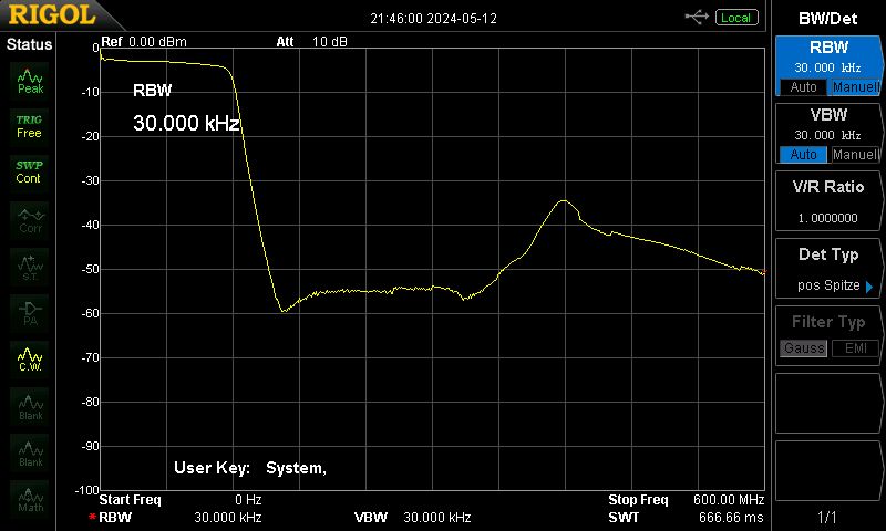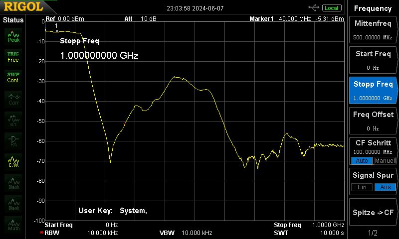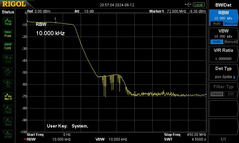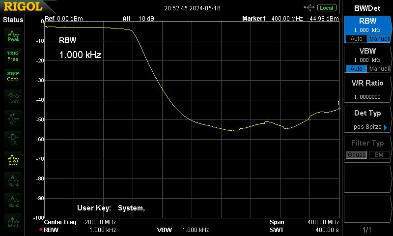 Hallo Roland, ich habe die Variante mit den C's umgesetzt und aus meinem sym. Filter wieder ein asym. Filter gemacht (mit etwas Glück passten die C's gerade noch in den geätzten Bereich). Der Weg über die sym. Filter war, glaube ich, ein Irrweg. hb ... Filter bis 400MHz hc ... Filter bis 1.5Ghz Ich habe das Filter dann an den AD9954 angeschlossen und im MaxHold-Modus etwas laufen lassen. Das Resultat ist ha. Die Leitungskapazitäten (ca.7p) schlagen an der Filterkante gnadenlos zu. Eigentlich so schlecht auch wieder nicht, wenn man bedenkt, dass der zweite Buckel die 2. Harmonische ist. Die 100MHz und die Mischprodukte 100MHz+/- eingestellte Frequenz waren mit -65dBm zu sehen. die 400MHz habe ich gar nicht gefunden. Was mich nach wie vor umtreibt ist die nachlassende Dämpfung ab 300MHz in den Filterkurven. So schöne -50dBm als Dämpfung wären schon nicht schlecht. Einfach damit alle Mischprodukte von der Taktfrequenz und dem 1:4 geteiltem Systemtakt definitiv weg sind (auch bei besserer Auflösung der BW). Viele Grüße Jens @ Rainer W. - Sorry ich habe wieder die falsche Datei ausgewählt.