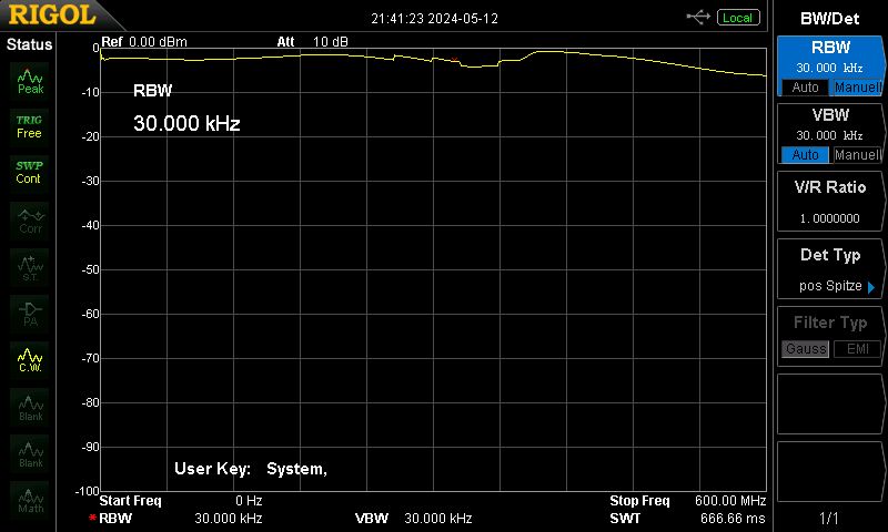 Hallo zusammen, neue Runde ich habe mir mal für den alten Uno eine neue Platine gebaut und das Ding dann einfach mit dem LMH ohne Filter verbunden. Der Software habe ich 41MHz mitgegeben und das Ziel (siehe Bild da) leicht verfehlt. Möglichst viele Vias einzubauen und den HF-Weg symmetrisch zu Gestalten habe ich mit gedacht. Die 2,7mm Streifenleitung für 50Ohm habe ich auch eingehalten. Was man gut sieht ist die Enveloppe, die 100MHz interne Verarbeitung und die Mischprodukte. (50MHz QuarzOszi und interne PLL) Wenn Interesse besteht rücke ich gern den Schaltplan und die Platine heraus. Da ich keine 100nH Spulen mehr hatte, habe ich mit der Heißluftpistole das Zeug von der "Rechteckplatine" gelötet und damit gealtert. Die Intension der obigen Anordnung war ja, die Entkopplung der Spulen. In der neuen Anordnung ist wieder alles in einer Linie und damit event. in Kopplung. Im Video: https://www.youtube.com/watch?v=1sq8Cvju2Oo wird die Wirkung der Trennwände sinnvoll beschrieben - also habe ich auch Zeug dazwischen gelötet. (Folie oder 0,7mm doppelseitige Platine) Die Filterkurven sprechen eine andere Sprache. Bei 350 MHz setzt die Anhebung ein und bei 500 MHz habe ich ein Maximum. Egal welchen Filter ich einsetze, ich habe immer das 350MHz-500MHz-egal Problem (statt Tiefpass). Wenn ich nur die Platine mit Buchsen versehe und dann in den Messkreis schalte habe ich keine Kopplung von Eingang und Ausgang. Wo liegt bei FR4 da das Durchstichproblem? Was mache ich im Design falsch? Alle meine Filter laufen bis 200 MHz gut und danach völlig aus dem Ruder. Ähnliche Beobachtungen, Hinweise ... wären gut. Vielen Dank. Jens
