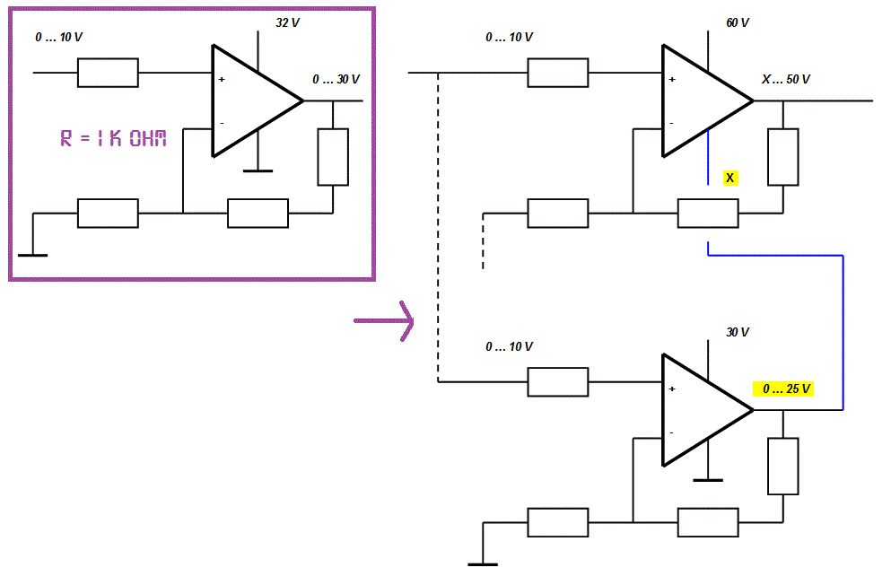 Wer hat Erfahrung mit der Kaskadierung von OP-Schaltungen, um die Spannung zu erhöhen? Ich hätte 2 OPVs, die jeweils nur maximal 36V vertragen, aber für die Anwendung einen ausreichenden Strom und GBWP mitbringen, die ich gerne kaskadieren möchte, sodaß sich die Spannungen und auch die Spannungsanstiegsgeschwindigkeiten addieren. Momentan werden die mit 30V betrieben, die neue Schaltung soll 50 V können. Wie könnte man das machen? Ich hätte vermutet, man speist den negativen Versorgungspfad des oberen OPV mit dem Ausgang des ersten und bekommt damit eine Spannungsaddition. Die benötigten 60V und 30V stehen aus einer kaskadierten Schaltung zur Verfügung. Wie macht man das mit den Eingängen und den Rückkopplungen? Für die feedback-Leitung hätte ich die Spannungsverstärkung von 3:1 auf 6:1 hochgesetzt (oder müssten es 5:1 sein ?). Die Idee ist, dass der das auch alleine könnte, wenn er genug slew rate hätte und er es so schafft, weil der andere OPV ihn schiebt. Allerdings bin ich nicht sicher, ob das mit den Eingangsspannungen passt. Muss ich die auch noch irgendwie verschieben, also z.B. die Ausgangsspannung von unten noch auf den negativen Eingang als Vergleich beaufschlagen? Oder sollte man einfach den GND der oberen Schaltung an den Ausgang des ersten OPV hängen?