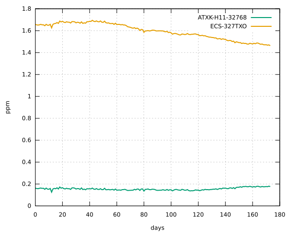 H. H. schrieb: > Peter R. schrieb: >> Wers noch genauer haben will, misst die Betriebstemperatur und >> korrigiert per Software die temperaturabhängige Frequenzänderung. > > Oder man nimmt einfach einen TCXO. TCXOs können sehr genau sein, ich habe erst vor kurzem einen Test über mehr als 6 Monate laufen lassen (die obige Grafik ist für 25°C und beginnt erst 2 Wochen nach dem Start) Beitrag "Re: Anschluss TCXO"