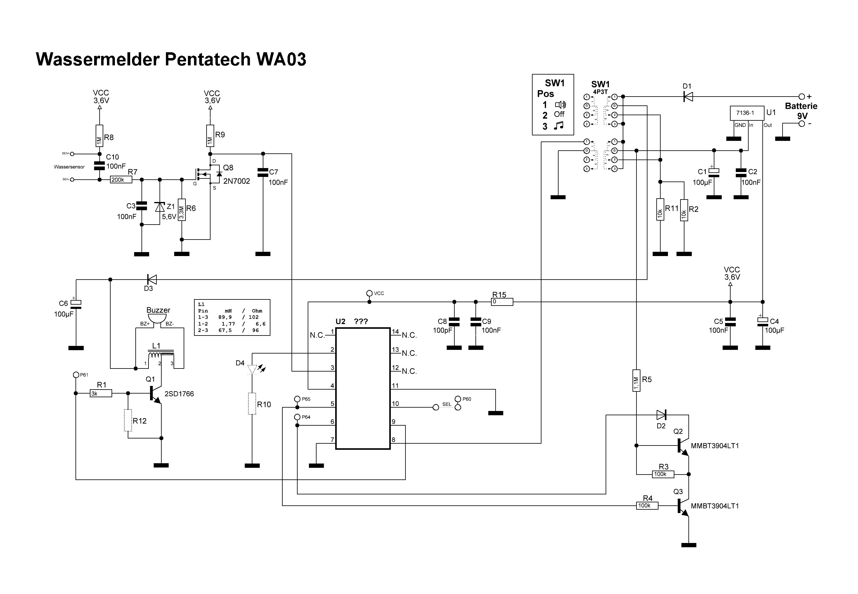 Hallo zusammen, eigentlich war die Idee meinen vorhanden Wassermelder an einen Mikrocontroller (ESP32) anzuschließen. Deswegen habe ich versucht durch Reverse Engineering einen Schaltplan aus der Platine zu erzeugen. Leider sind aber ein paar Fragen dazu offen geblieben. Die Widerstände und Kondensatoren habe ich bestimmen können, die Halbleiter zum großen Teil auch (glaube ich zumindest). U2 (SO-14) und D3 sind leider abgeschliffen worden. Q1 SOT-89 DB RH = 2SD1766 Transistor NPN Q2=Q3 SOT-23 1AM Z = MMBT3904 Transistor NPN Q8 SOT-23 12W 04 = 2N7002 N-Ch Mosfet U1 SOT-89 7136-1 = LDO 7136 3,6V D1 M4 = 1N4004 D2 = Universaldiode Z1 = Z-Diode 5,6V (ausgebaut und gemessen) 1. Stimmen die Bauteile so wie ich oben aufgelistet habe? 2. Erkennt jemand was U2 für ein IC sein könnte? Ich vermute (befürchte) ein MC (PIC o.ä.). 3. Was ist den L1 für eine Spule/Drossel/Transformator? Der Buzzer der daran angeschlossen ist macht einen Höllen Lärm. Wie heißt den so ein Teil und wo gibt's das? 4. Die Schaltung um Q2 und Q3 kommt mir etwas komisch vor. Kann die richtig sein? Bin mir aber schon sicher die korrekt aufgenommen zu haben. Wäre für jede Hilfe dankbar.
