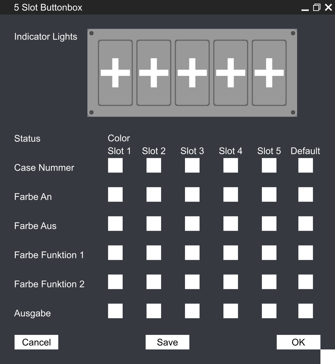 So stelle ich mir die GUI vor ( ist jetzt nur mal schnell dahin gezeichnet). Jedes der großen "+" Zeichen ist quassi ein Sockel, worauf ein Modul gesteckt werden kann (Taster-Modul, Schalter-Modul, Joystick-Modul......). Klickt man nun auf das "+", öffnet sich ein Fenster, oder Dropdown Menü, welches alle Module aufliestet. Das ausgewählte Modul, oder die Eingabe der Case Nummer senden nun die Casenummer zum uC, der wiederum das passende Case der Switchfunktionm zuortnet. Weiterhin können die Farben und Ausgabe in den Feldern darunter angegeben werden.