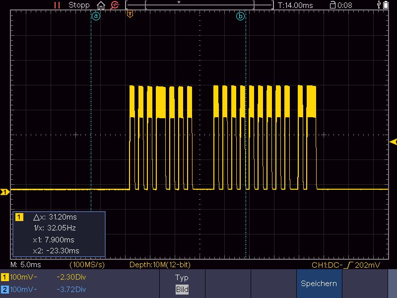 Lukas S. schrieb: > Weiss jemand um welchen Code es sich handelt ? Was willst du wegen dieses kleinen Unterschiedes jetzt für ein Fass auf machen. Mit dem Namen des Codes kann der Atmel 2313 sowieso erstmal nichts anfangen. Du solltest dir das Signal allerdings noch einmal mit einer deutlich höheren Zeitauflösung angucken, damit du die Trägerfrequenz erfährst. p.s. Merkst du den Unterschied? Das ist einen Faktor 400 kleiner bei zusätzlich noch höherem Informationsgehalt. Lukas S. schrieb: > 20000101_000827.bmp > 1,4 MB > > 20000101_000801.bmp > 1,4 MB