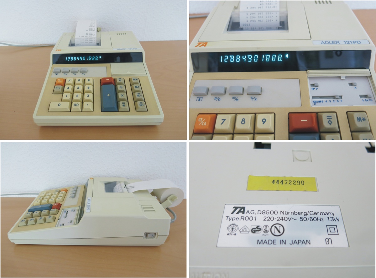 Hallo zusammen, ich möchte einen uralten Tischrechner TA 121PD anbieten. Herstellungsjahr: ca. 198? Zustand: kaum genutzt, funktioniert einwandfrei, mit 2 Papierrollen Preis: 20€ inkl. Versand mit Hermes innerhalb DE Bei Interesse bitte direkt an meine Mailadresse k_seibel(at)mail(dot)ru melden. VG Konstantin Reserviert VERKAUFT!