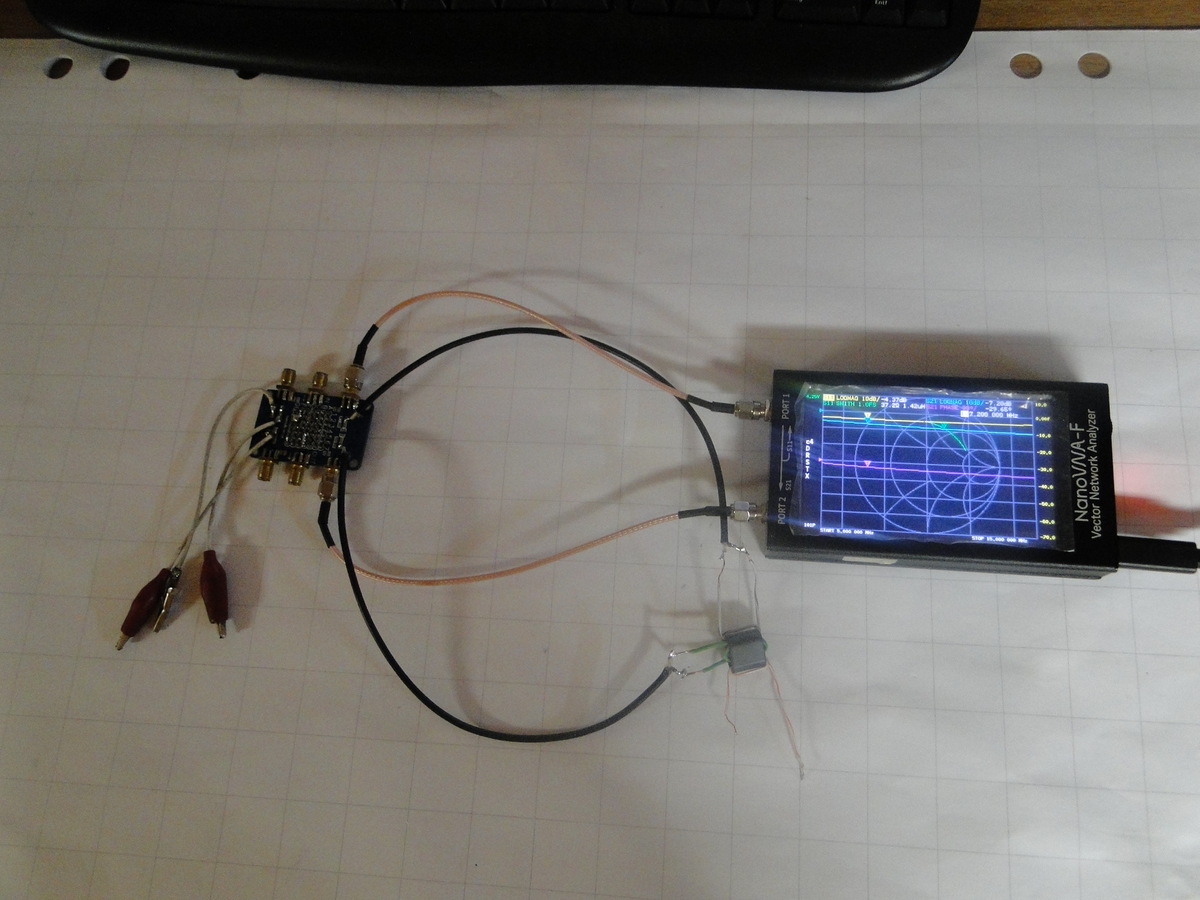 Ganz einfache Testschaltung: Signaleinspeisung von 10MHz auf dem Mittelsteg zeigt auf beiden Außenseiten eine fast 1:1 Übertragung. Einspeisung auf einer Außenseite lässt auf der anderen Außenseite nurnoch ein ganz kleines Signal ankommen.