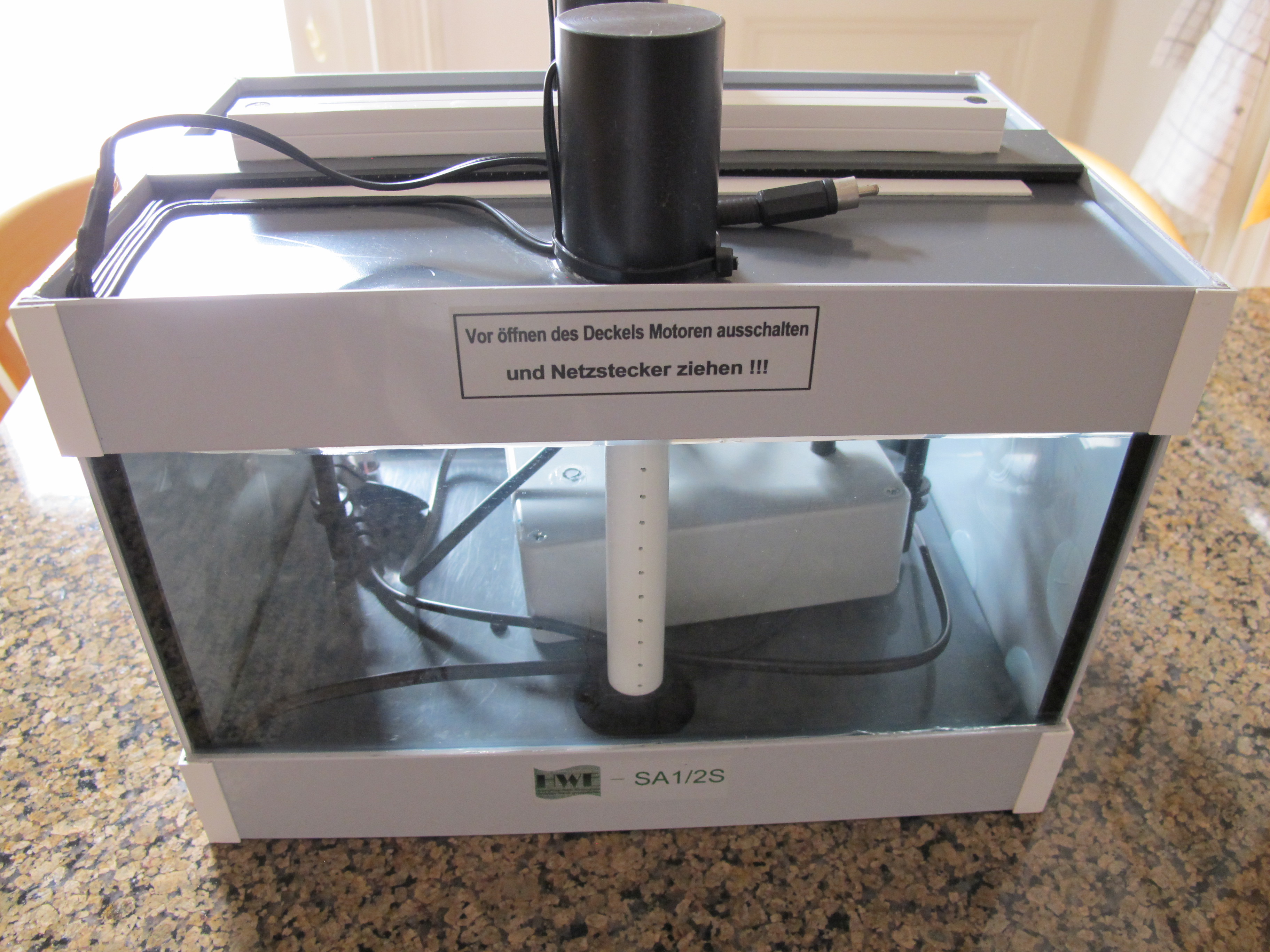 Anlage siehe Bilder. Impeller und Heizung funktionieren - wollte kein Wasser reingeben, was ich wieder abtrocknen muss. Die Gumminippel haben sich abgelöst / leicht zerlegt, aber alles Andere ist fast um Neuzustand. Selten genutzt, da ich irgendwann die Lust am Ätzen verloren habe. Jetzt wandere ich aus (falls sich jemand über die vielen Angeboten wundert) und setze mich zur Ruhe (Meer u. Sonne :-) ) Preis 60,-- € zzgl. Versand ca. 15 € weil ich zusätzliches Verpackungsmaterial besorgen muss (da die Wanne aus Glas ist). Abholung gerne in Wiesbaden oder Darmstadt (dort bin ich ab und an Montags).