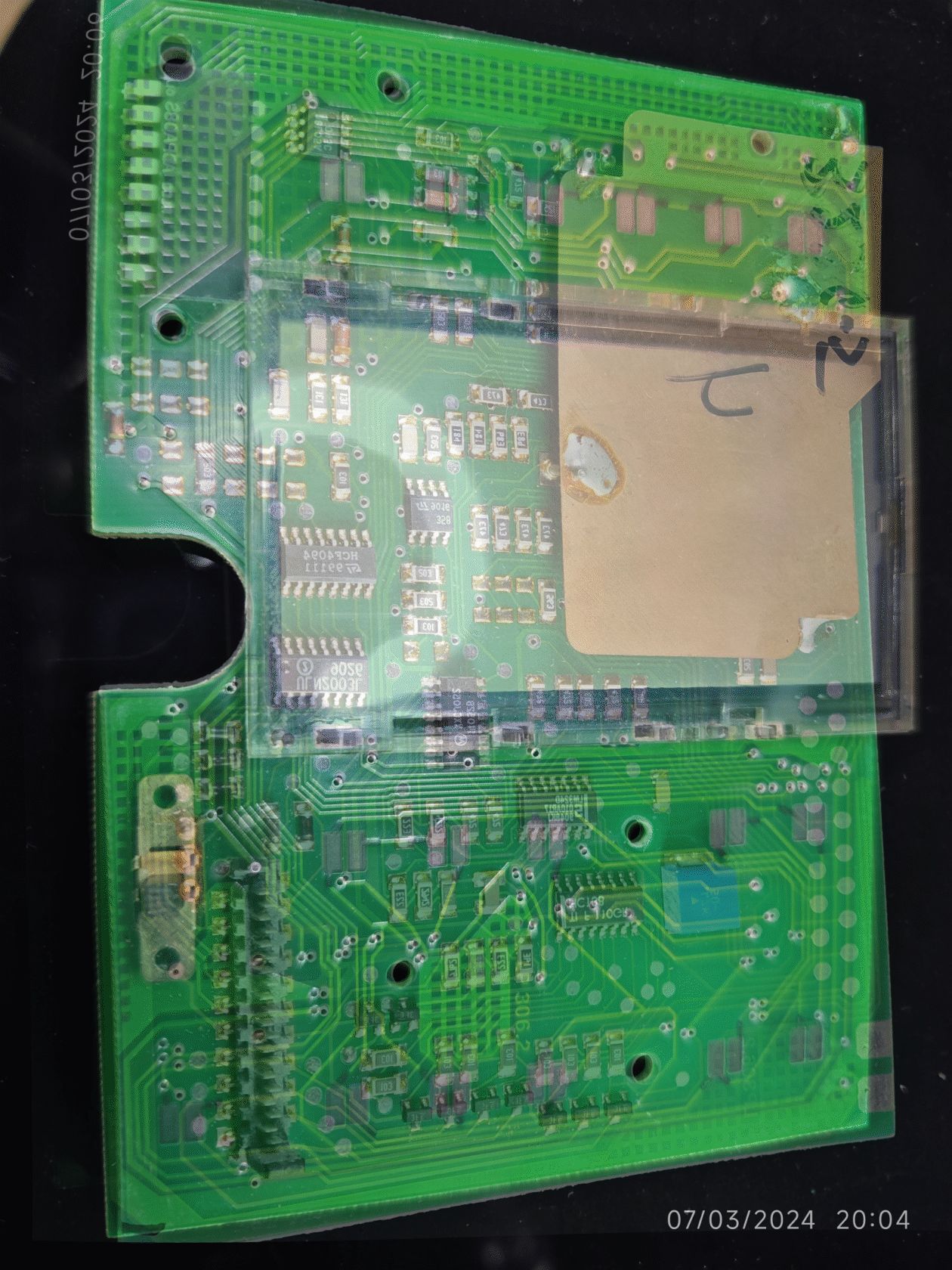 Das Display kann draufbleiben, zur fehlereingrenzung braucht man sicher keinen Kompletten schaltplan abmalen, ein grobes Blockschaltbild reicht. Können wir (Hans, Frank u.a) hier bitte mal mit den ganzen Unkenrufen und der Demotivation aufhören? Das tut nichts zur Sache. Der TO liefert alle Infos, um ihn zu unterstützen und scheint motiviert am dazulernen. Jetzt soll er erstmal eine Elektronikerausbildung durchmachen? Die beiden ausgänge des CD4052 gehen in den LM324. also hängt dieser weiter hinten in der signalkette. Bei diesen beiden chips kann man mal die Versorgungsspannungen messen: mit einem Netzteil strombegrenzt 12V auf pin 9 von links, masse auf pin 12 oder 16 geben (Bild IMG_20240703_200607.jpg) Dann am (7)8L05A (8-pin rechts unten) schauen ob 5V rauskommen. (pins laut datenblatt) Dann an den beiden Chips die Versorgungsspannung messen. (pins laut datenblatt) dann eine befestigung des kupferschirms loslöten oder abknipsen, prozessor bestimmen (bild) und dessen referenzspannungspin nachmessen. Wenn alle spannungen stimmen, dann nacheinander MUX und OPV tauschen.