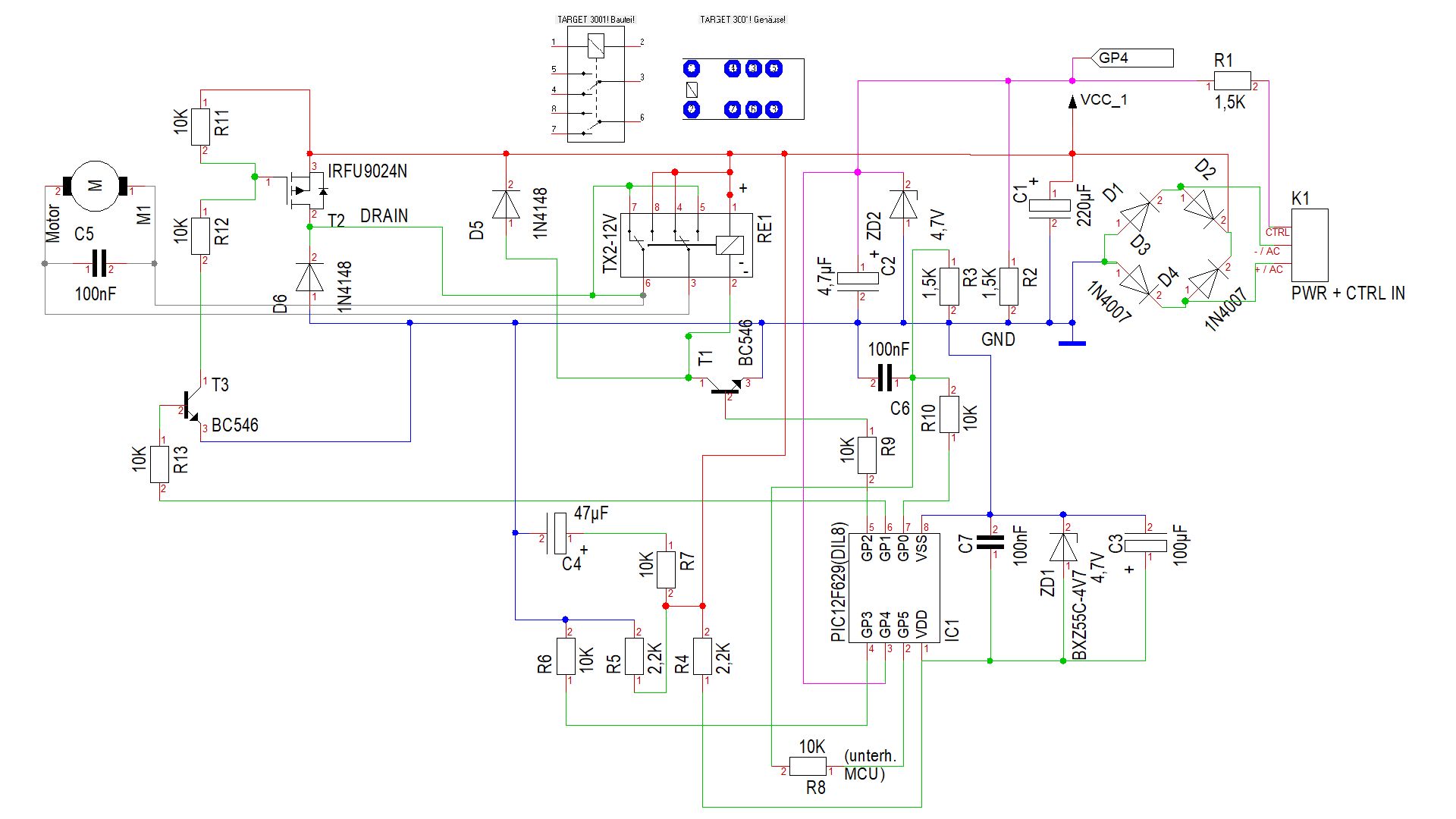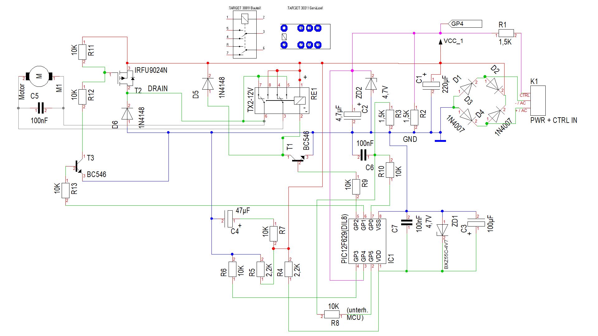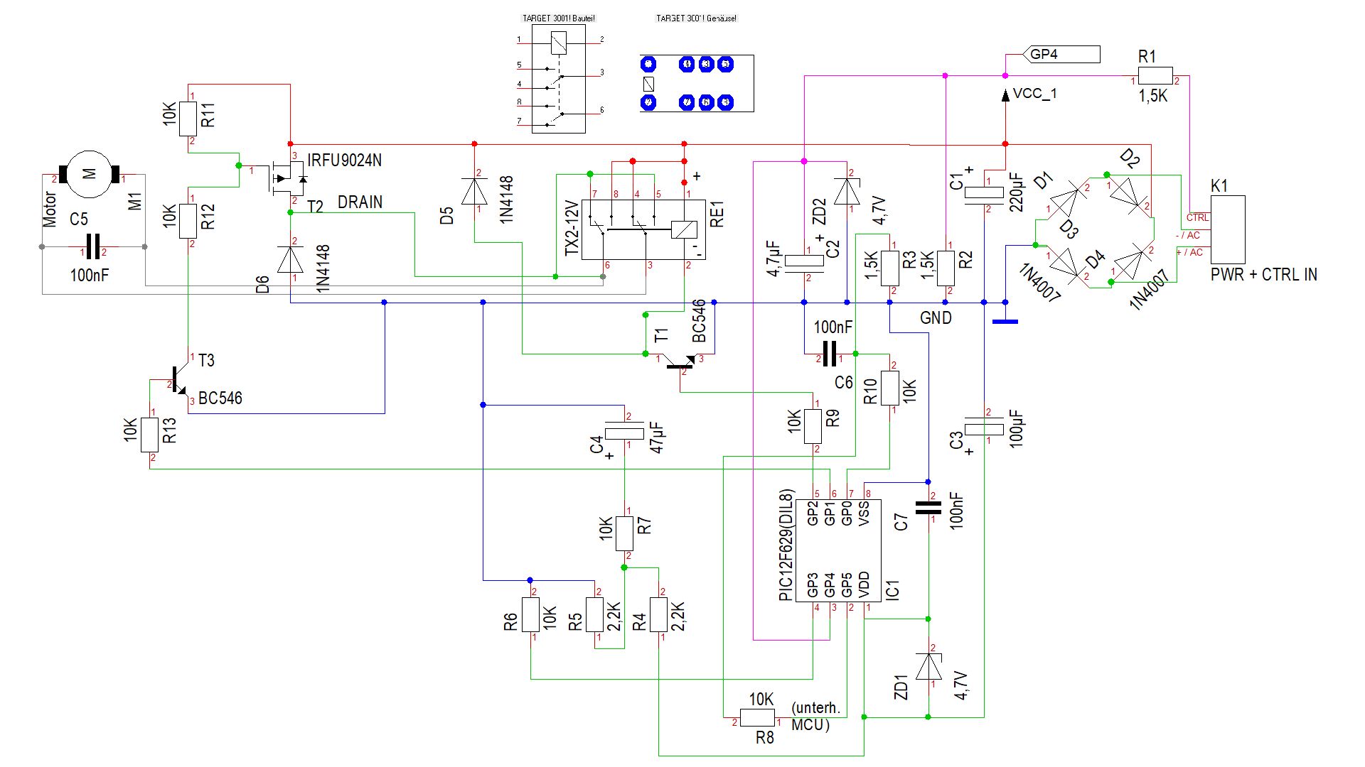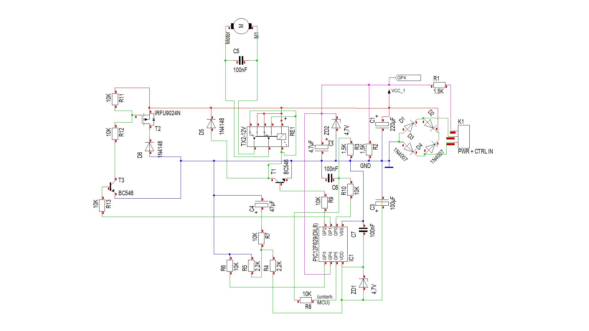 Danke Axel, ich habe die Verbindungen unterhalb des Relais übersehen. So ergibt es mehr Sinn - die Masseverbindung der Relaiskontakte für den Motor hängen am DRAIN des FET. Aber angesteuert wird der MOSFET doch - über GP1 Vorhin habe ich das Ding noch mal angeschlossen, da bekam plötzlich der PIC keine Betriebsspannung (bzw. < 1 V) und der Motor drehte. Seltsam. Aus der Schaltung werde ich auch nicht schlauer.