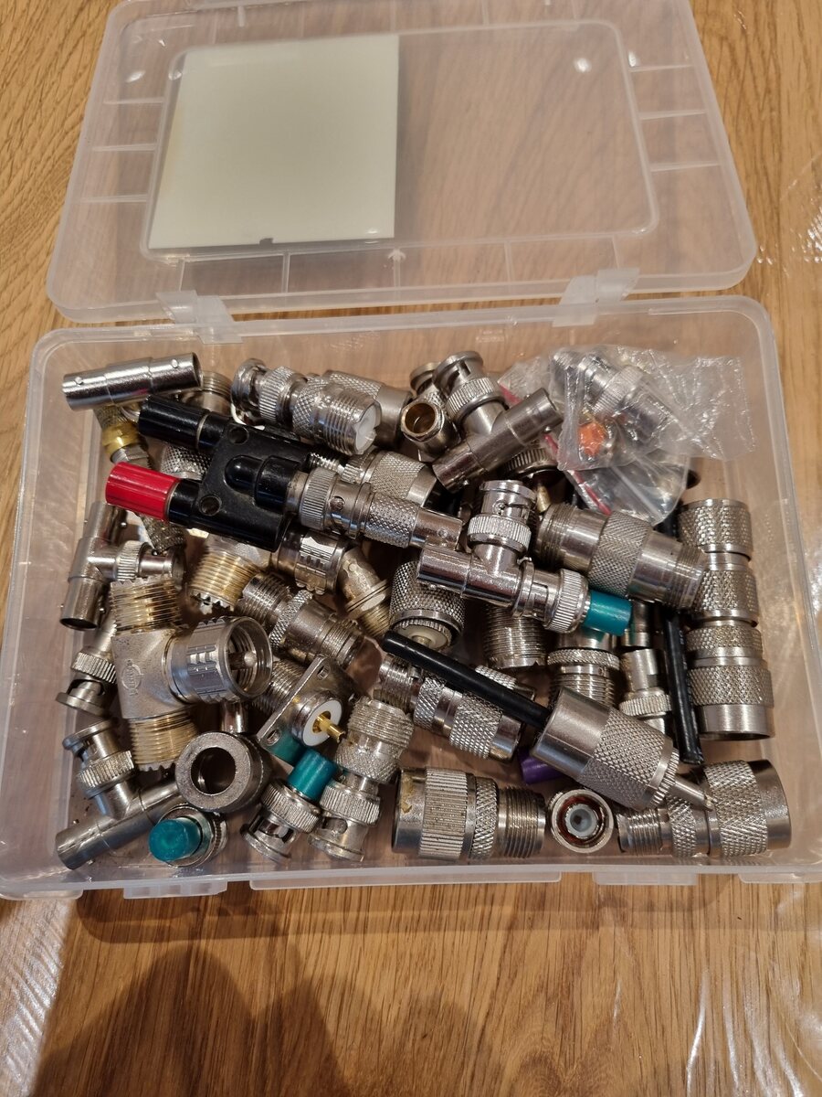 Tipp: Box ausschütten und so fotografieren, das die Anzahl der (BNC)-Adapter erkennbar ist. Da sind einige dabei, die neu schon ein paar Euro kosten und für Scope-Arbeiten ganz praktisch sind. Und die PL-Stecker/Adapter sind sicher für Antennenbauer aus dem HAM-Bereich interessant.