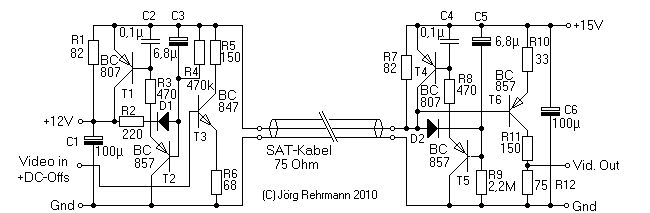 Ich weiß nicht, ob ich das richtig kapiert habe, aber ich füge mal eine Schaltung von Jörg Rehrmann an, der mir das sicher verzeiht. Da werden 12V über die Leitung zum Input übertragen und FBAS Video. Ist eigentlich für eine Kamera gedacht, aber was solls. Und es ist ein GIF - was solls :-) Übrigens findet sich hier im Ausgangsmodul auch die o.a. Klemmschaltung zur Rückgewinnung des Schwarzwertes.