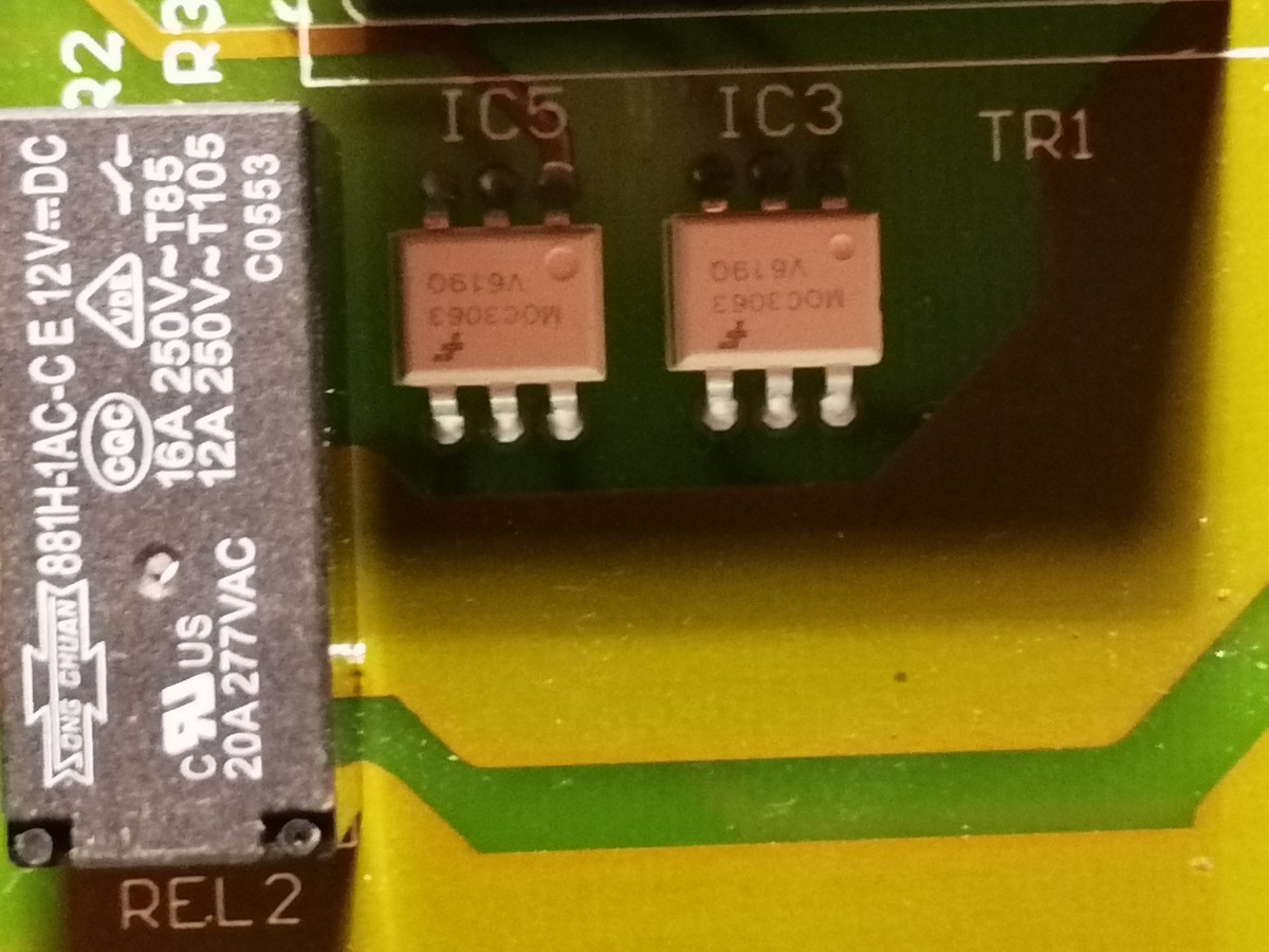 IC3, 4 und 5 sind Optokoppler, die die TRIACs Q1 bis 3 ansteuern. Das sind deine Leistungsstufen, die Relais dienen vermutlich der doppelten Sicherheit, damit dir die Bude nicht abbrennt, wenn ein TRIAC durchgeht. Ich würde mir LEDs mit Vorwiderstand zurechtmachen und schauen, ob die Optokoppler angesteuert werden, die TRIACs den OK folgen, die Relais angesteuert werden und ob hinten was rauskommt.