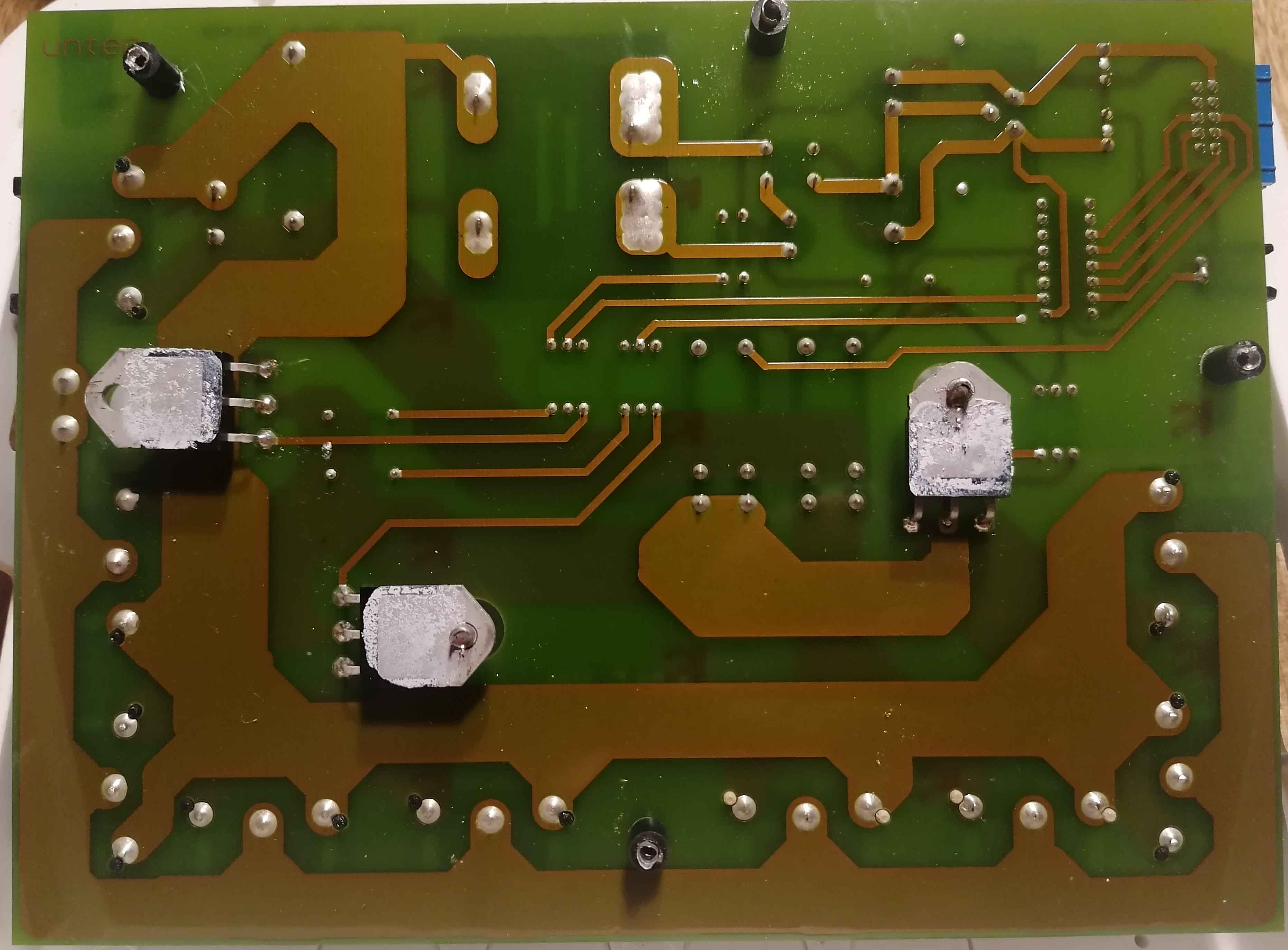 Der ULN2003AN ist ein Darlington-Transistor-Array. Der wird die Relais ansteuern. https://www.ti.com/document-viewer/uln2003a/datasheet Da mal erstens zwischen Pin 9 und Pin 8 messen (siehe Datenblatt) ob überhaupt 12VDC messbar sind. Die Frage ist auch, ob der überhaupt am Eingang angesteuert wird. Am ULN2003AN sind Pin 1 bis Pin 7 die Eingänge 1 bis 7. Aber es scheinen nur Eingang 3 bis 7 verbunden, wobei davon die zugehörigen Ausgänge 5 - 7 (am ULN2003AN) zu den 3x MOC3063s gehen für die Ansteuerung der Triacs. Die Ausgänge 3 und 4 scheinen zu den Relais zu gehen. Ausgang 3 über SV4 (den Übertemperaturschutz). Wenn man den brückt, sollte der Schutz temporär zum Testen außer Kraft gesetzt sein, wenn ich die Leiterplatte korrekt verstanden habe und alle Leiterbahnen richtig nachverfolgen konnte. Bild von IC1 Aufschrift wäre auch noch nicht verkehrt. Schätze LM7805. D.h. Testen ob am Eingang 3 vom ULN2003 ca. 5V (gegen GND) anliegt, wenn die Sauna heizen sollte. Ist aber bei offener Platine für Laien sicher gefährlich.