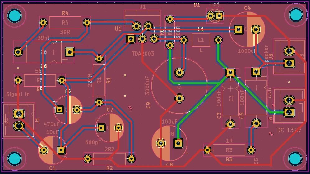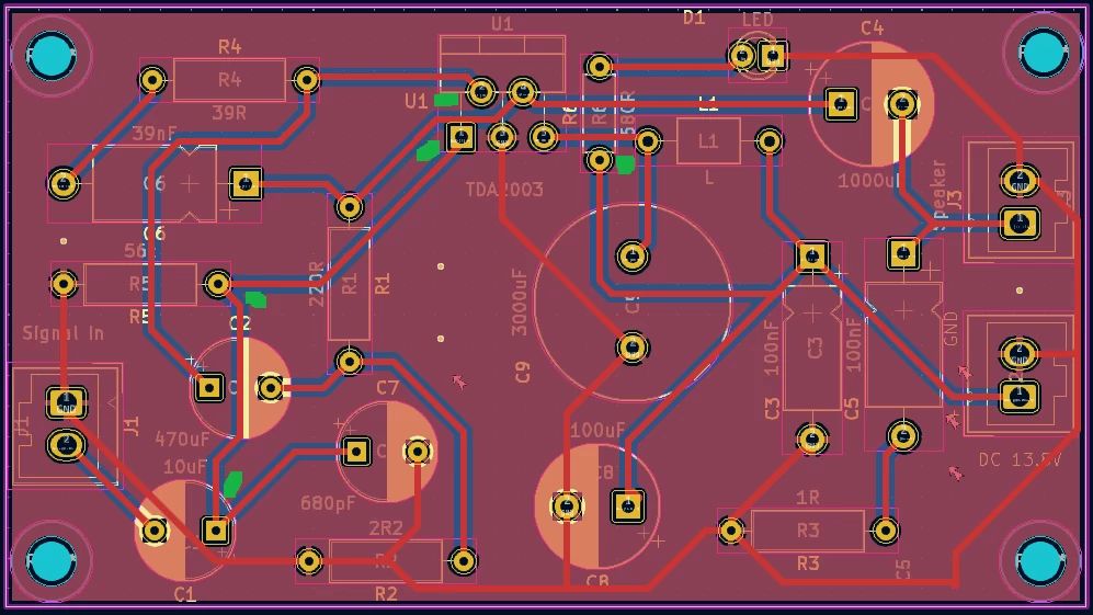 Hi, Vorschlag: C6 noch etwas nach rechts schieben damit Du besser an die Schraube des TDA rankommst. Nicht nur vorne sondern auch hinten am Print Befestigungslöcher vorsehen. Die Sicherung weiter zum PCB-Rand damit Du im Servicefall leichter dran kommst. Auch eine LED incl. Vorwiderstand als Betriebsanzeige kommt gut. Besonders universell wird der Print wenn Du noch den Brückengleich-riecht-er vorsiehst, ggf incl. Lötpunkte für externen Ladeelko (über 2x1,5mm²) angeschlossen. Auf Zugentlasungsbohrungen achten. Gruß Ralf p.s. in einer Funkschau in den 80ern wurde das Thema Masseführung bei integrierten Audioverstärkern ausführlich beschrieben. Thema waren damals die 16kHz der Zeilenendstufe aber auch das Lichtmaschinenpfeiffen bei externen Audio-Amps von Autoradios. Ich habe damals einen Blaupunkt von TDA2002 nach TDA2003 Brückenschaltung upgegraded - oder war es TDA 2004/2005? - menno, schon so lange her.
